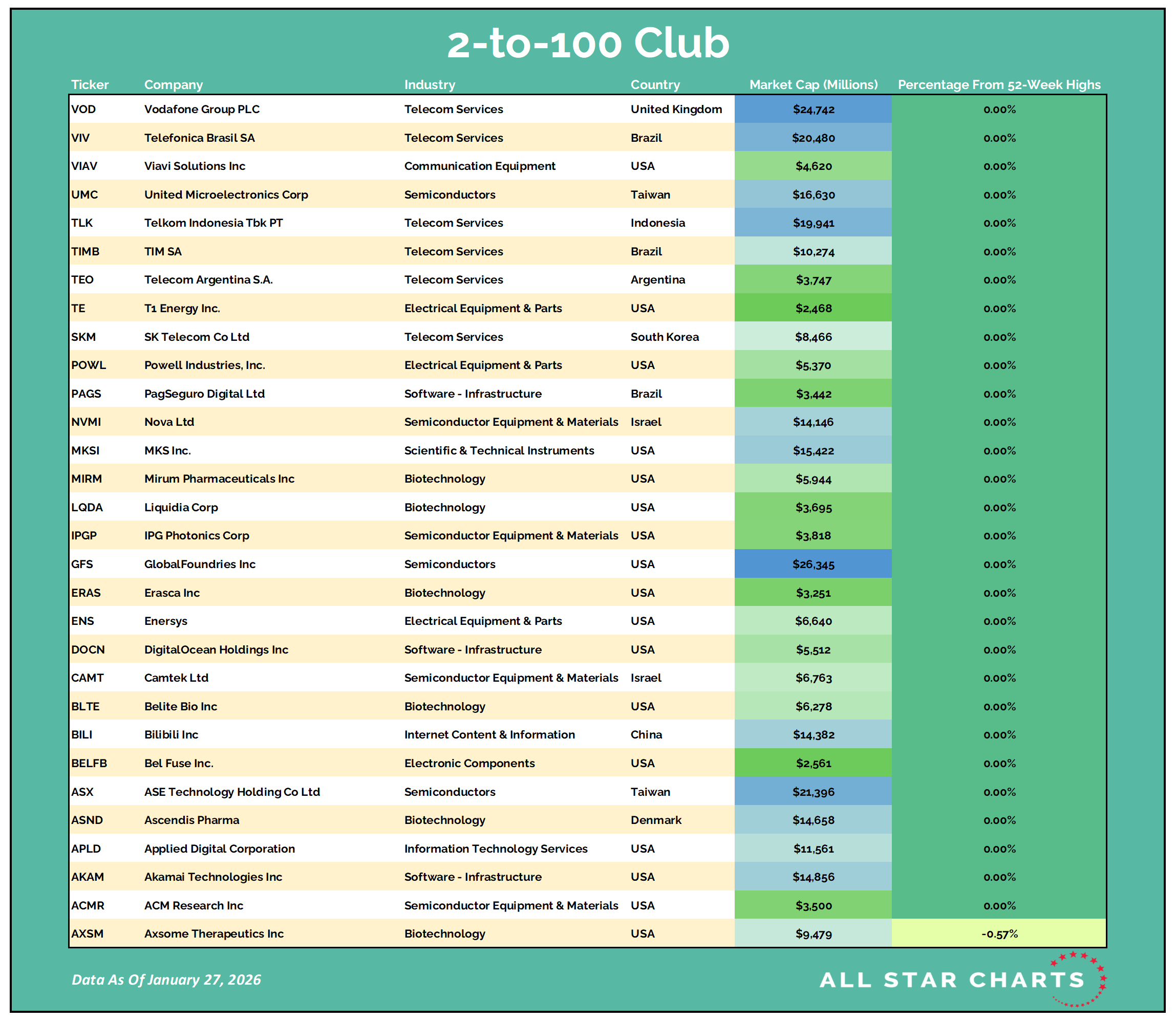 Once they graduate from small-cap to mid-cap status (over $2B), they come on our radar. Likewise, when they surpass the roughly $30B mark, they roll off our list.