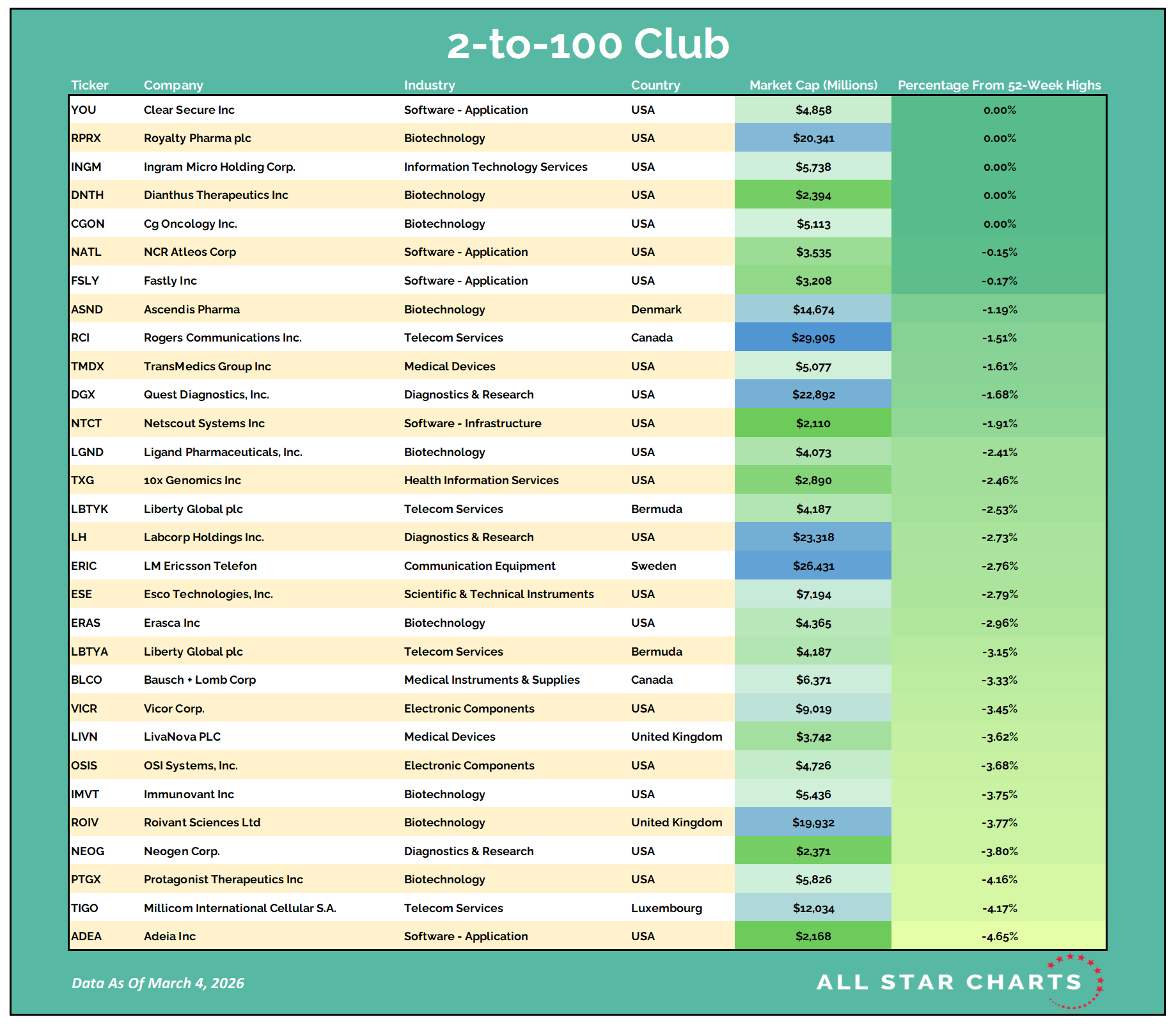 Once they graduate from small-cap to mid-cap status (over $2B), they come on our radar. Likewise, when they surpass the roughly $30B mark, they roll off our list.