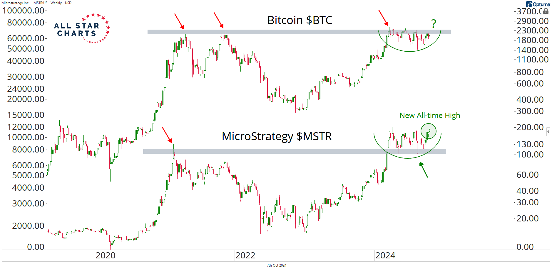 Alfonso's Daily Note Alfonso De Pablos highlights the day’s most important market-moving chart. MicroStrategy Leads the Way By Alfonso Depablos, CMT October 7, 2024 Today, I joined my friend Patrick on Chart Request Live, discussing all the ticker symbols from the chat.Click here to watch the replay.One major topic we discussed at the end of the show was crypto and some equity vehicles to gain exposure to it.One that stood out was MicroStrategy $MSTR, which continues to show impressive relative strength. As you can see, MSTR is consolidating above its prior cycle peak as it flirts with new all-time highs.Meanwhile, Bitcoin continues to consolidate below $70,000, putting it beneath all that overhead supply from the prior cycle.In addition, MSTR has acted as a leading indicator in the past and I don’t think this time will be any different.If MSTR can break out with authority, it should only be a matter of time before Bitcoin follows the same path and completes this historic base.If and when that happens, I want to be long the best-performing and most-leveraged vehicles to bet on higher BTC prices.That’s exactly what MSTR offers. I’m long Michael Saylor and co on a breakout above 200.Alfonso More from Alfonso's Daily Note Alfonso Depablos, CMT The Return of the Trump Trade November 6, 2025 Alfonso Depablos, CMT Who’s Got It Right? November 5, 2025 Alfonso Depablos, CMT Weak Spots in a Bull Market November 4, 2025 See the Chart That MattersAlfonso’s Chart of the Day highlights the setups and inflection points shaping the next big market moves — before they hit the headlines. You must have JavaScript enabled to use this form. Email Address