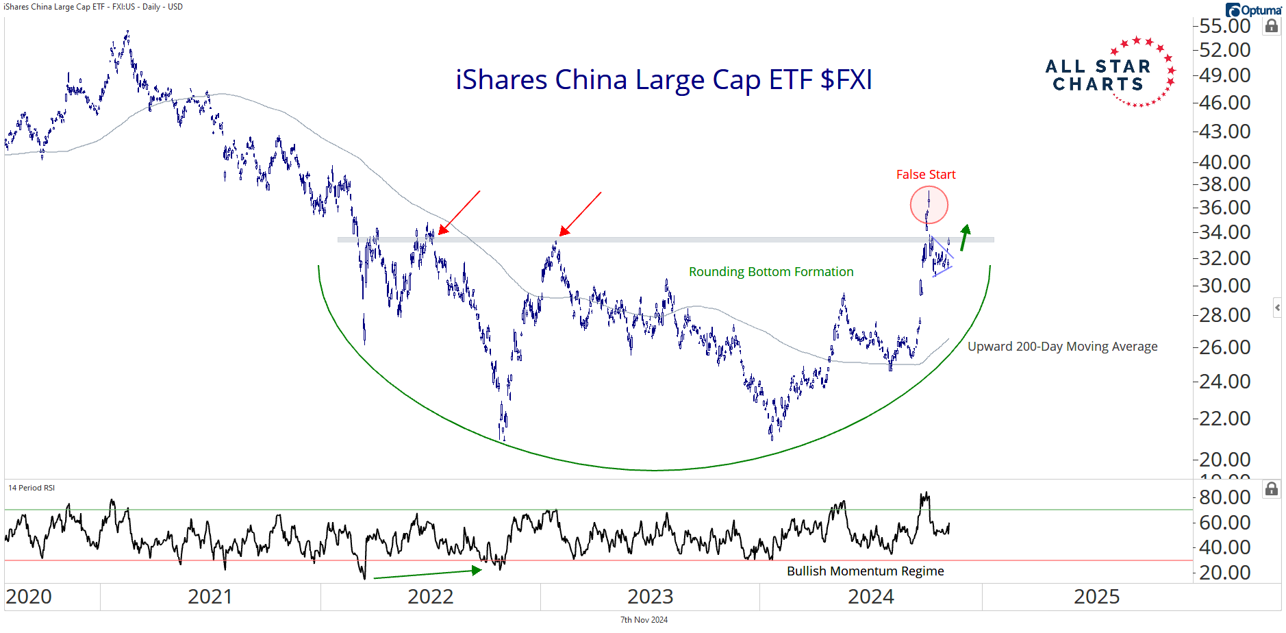 Here’s the iShares China Large-Cap ETF $FXI, on the cusp of completing a bearish-to-bullish reversal pattern.