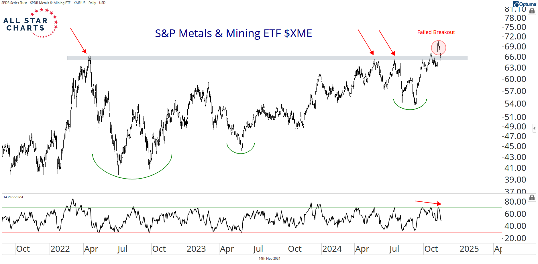 The SPDR S&P Metals & Mining ETF $XME is a great example of this second group that is losing steam.