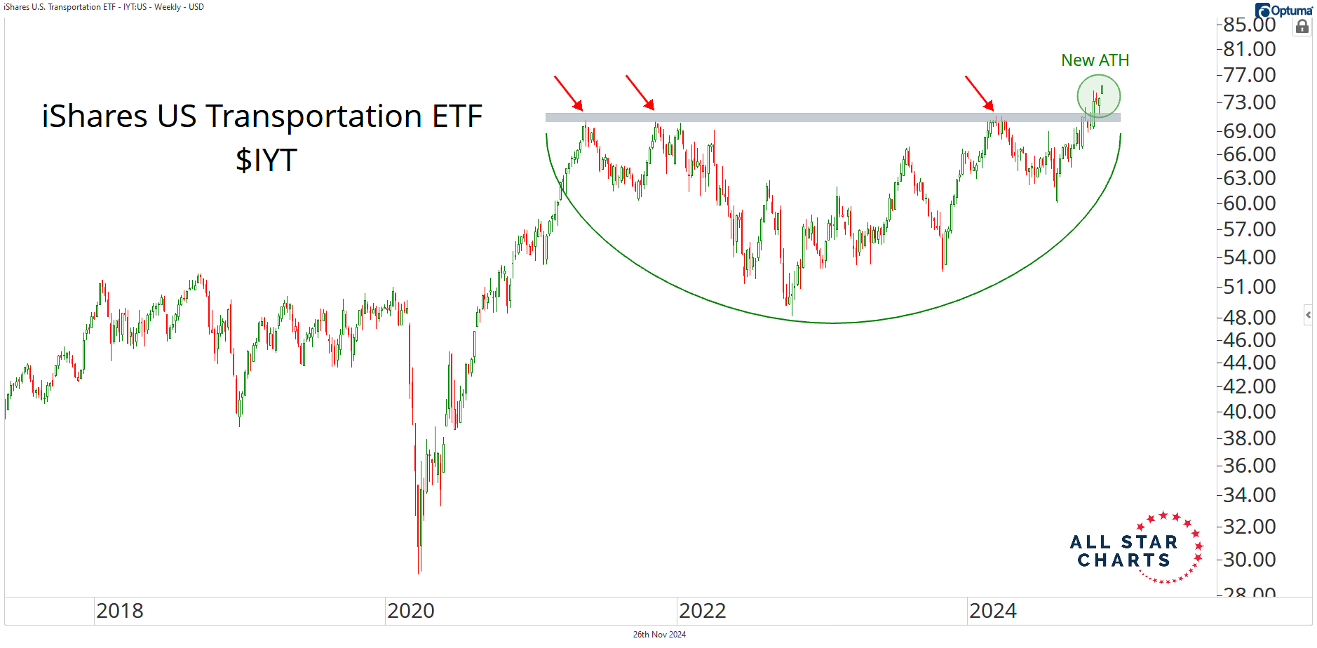 The iShares US Transportation ETF $IYT is breaking out of a massive base to new all-time highs.