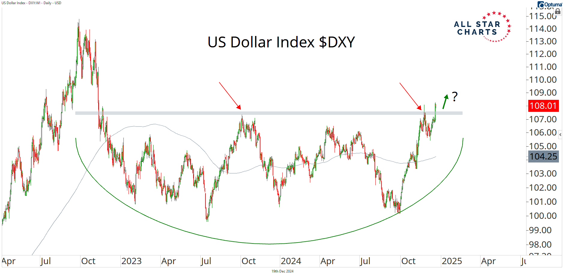 Alfonso's Daily Note Alfonso De Pablos highlights the day’s most important market-moving chart. Dollar Breakout: Trouble Ahead for Stocks? By Alfonso Depablos, CMT December 19, 2024 While most uptrends have come under pressure in December, the rally in US Dollars has remained strong.The US Dollar Index $DXY has been climbing in a near-vertical line since it bottomed at the lower bounds of its range three months ago.Today, DXY is attempting to break out of a base as it trades at its highest level in over two years. A decisive breakout in the dollar could shift the tide and put significant pressure on risk assets.As long as the DXY holds above the critical 107.50 level, stock market bulls are on high alert.Dollar headwinds are the last obstacle stocks want to face heading into the holidays.Discover Sean's game plan for navigating potential market changes next year. Click here to watch his exclusive session on the options strategies he’s preparing for various market scenarios.Alfonso I'd really appreciate it if you could spread the word!If you know anyone who might find this valuable, feel free to share this note to them.Here’s the link where they can sign up and join in! More from Alfonso's Daily Note Alfonso Depablos, CMT The Return of the Trump Trade November 6, 2025 Alfonso Depablos, CMT Who’s Got It Right? November 5, 2025 Alfonso Depablos, CMT Weak Spots in a Bull Market November 4, 2025 See the Chart That MattersAlfonso’s Chart of the Day highlights the setups and inflection points shaping the next big market moves — before they hit the headlines. You must have JavaScript enabled to use this form. Email Address
