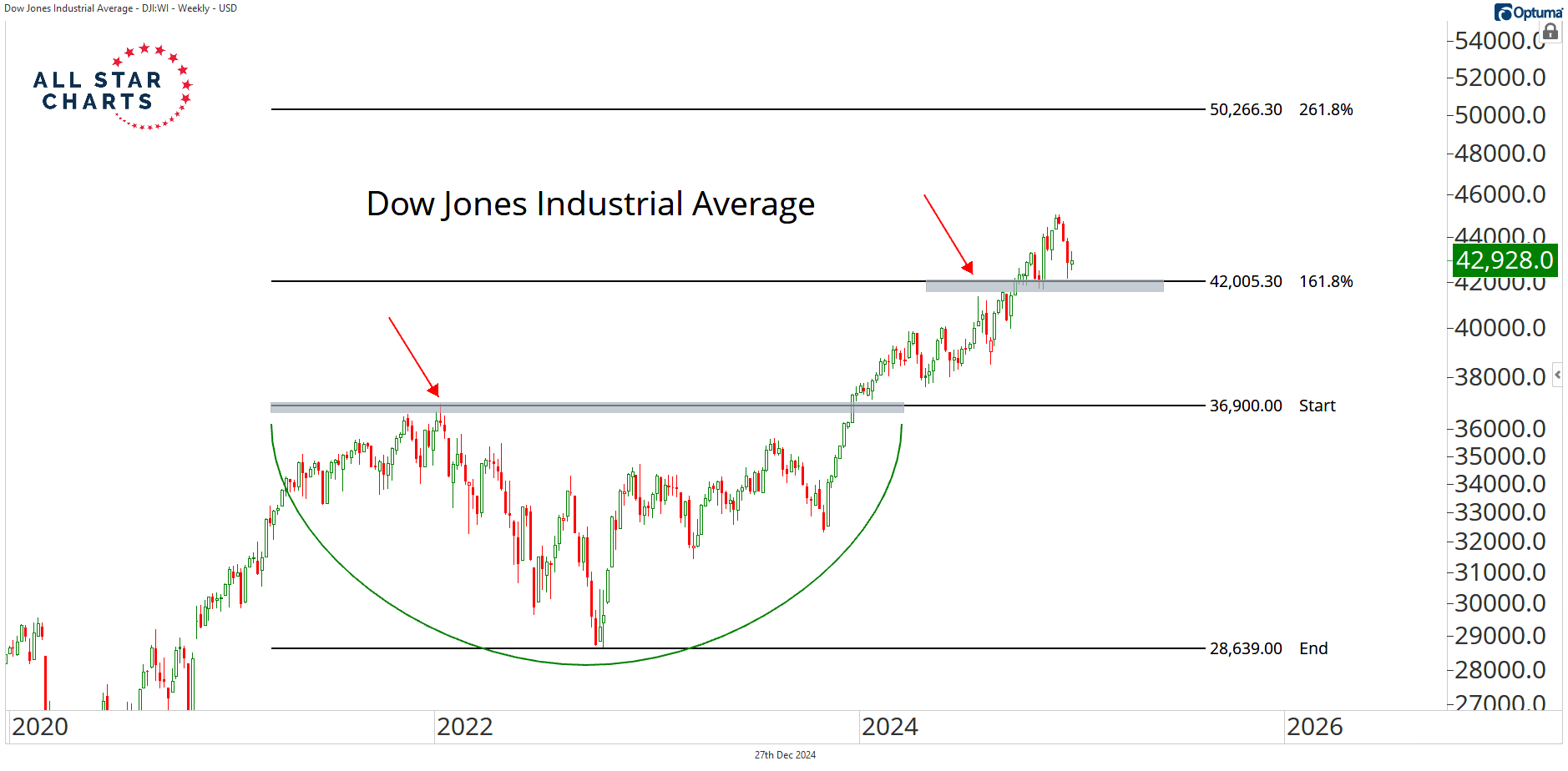 Right now, the Dow is sitting at a critical Fibonacci extension level, around 42,000. That also lines up with the July highs, adding more weight to this key area.