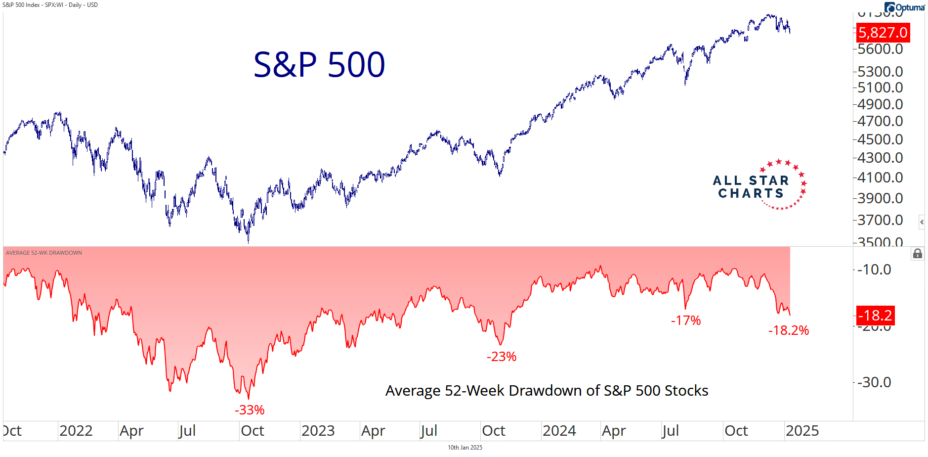 The average 52-week drawdown of S&P 500 stocks has reached -18.2%. This means the average stock is experiencing its sharpest decline in over a year.