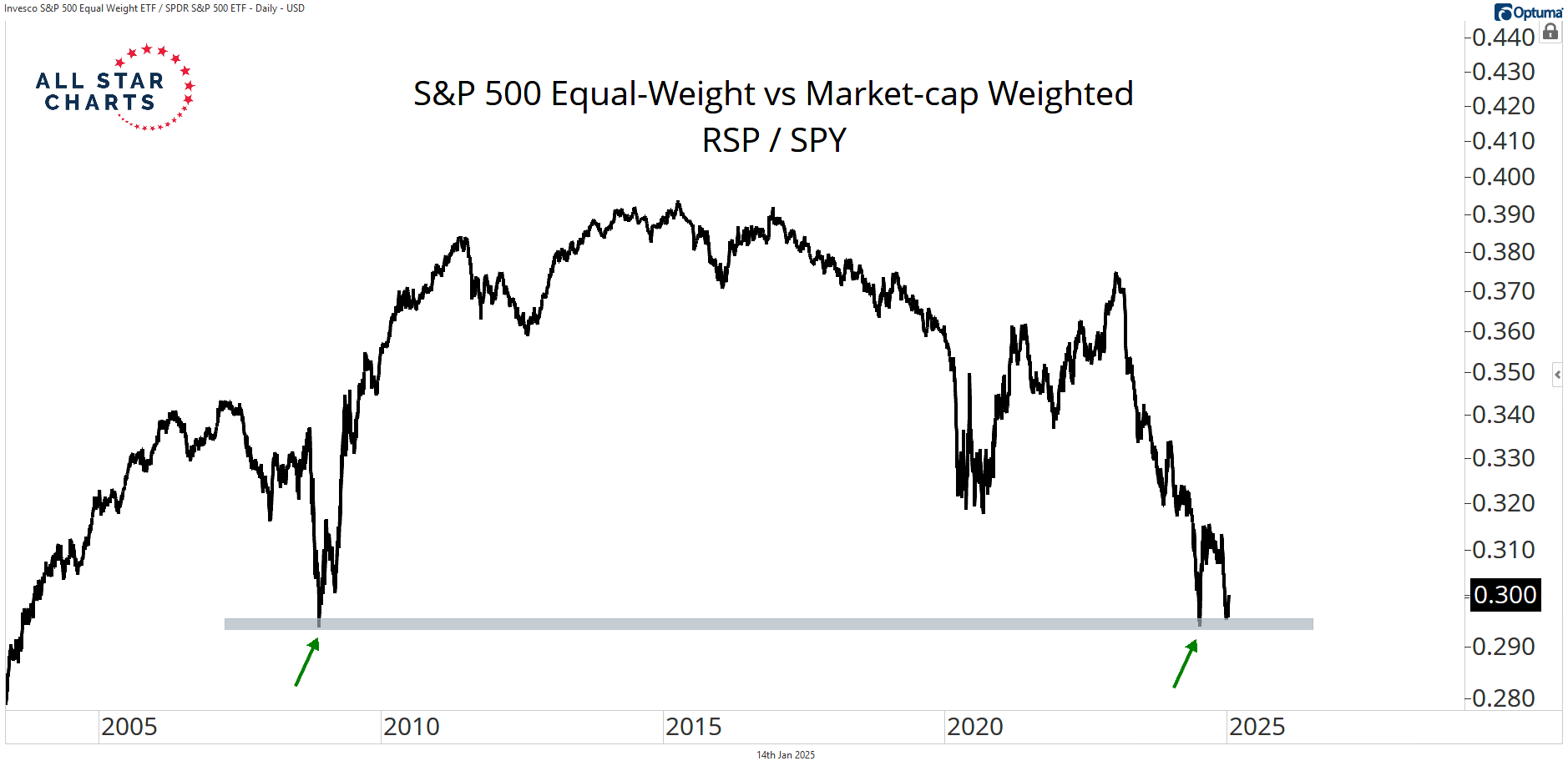 The chart of the equal-weighted S&P 500 $RSP relative to the market-cap-weighted S&P 500 $SPY can provide valuable insights.