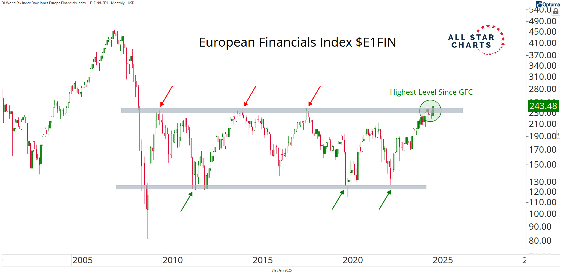 Alfonso's Daily Note Alfonso De Pablos highlights the day’s most important market-moving chart. European Financials Hit Its Highest Level Since GFC By Alfonso Depablos, CMT January 31, 2025 Another international theme on my radar right now is European banks.These stocks serve as a strong gauge of global risk appetite. Typically, when they perform well, risk assets are in good shape.The European Financials Index $E1FIN just closed the month at its highest level since the Great Financial Crisis. This is particularly important for a lot of international indexes that are heavily-weighted in bank stocks.If this breakout holds and we see follow-through in the coming weeks, it’s hard to imagine markets or the economy falling apart.This was a very important topic we discussed yesterday in my presentation, and I think we all agreed.After all, if these stocks are thriving, how bad could things really be?Have a good weakened, everyone!Like this note? If you're not subscribed, make sure to sign up and get these straight to your inbox every day. AlfonsoP.S. If you want to attend future events with the entire All Star Charts team, click here and apply. More from Alfonso's Daily Note Alfonso Depablos, CMT The Return of the Trump Trade November 6, 2025 Alfonso Depablos, CMT Who’s Got It Right? November 5, 2025 Alfonso Depablos, CMT Weak Spots in a Bull Market November 4, 2025 See the Chart That MattersAlfonso’s Chart of the Day highlights the setups and inflection points shaping the next big market moves — before they hit the headlines. You must have JavaScript enabled to use this form. Email Address