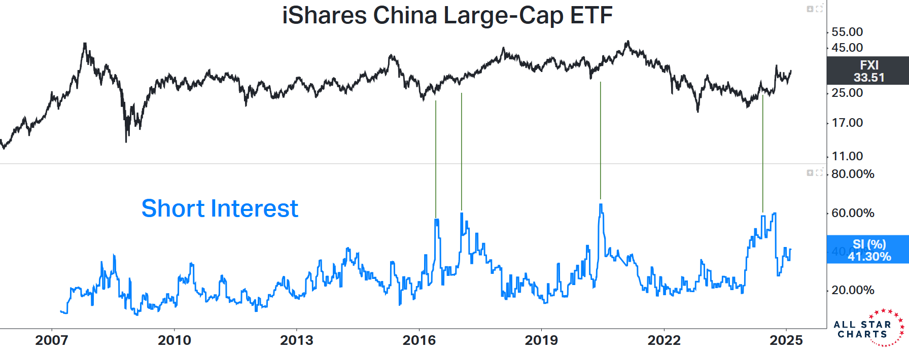 Just look at this chart. Short interest in the Large-Cap China ETF $FXI was recently at the highest level it's been in the last year and is still elevated today.