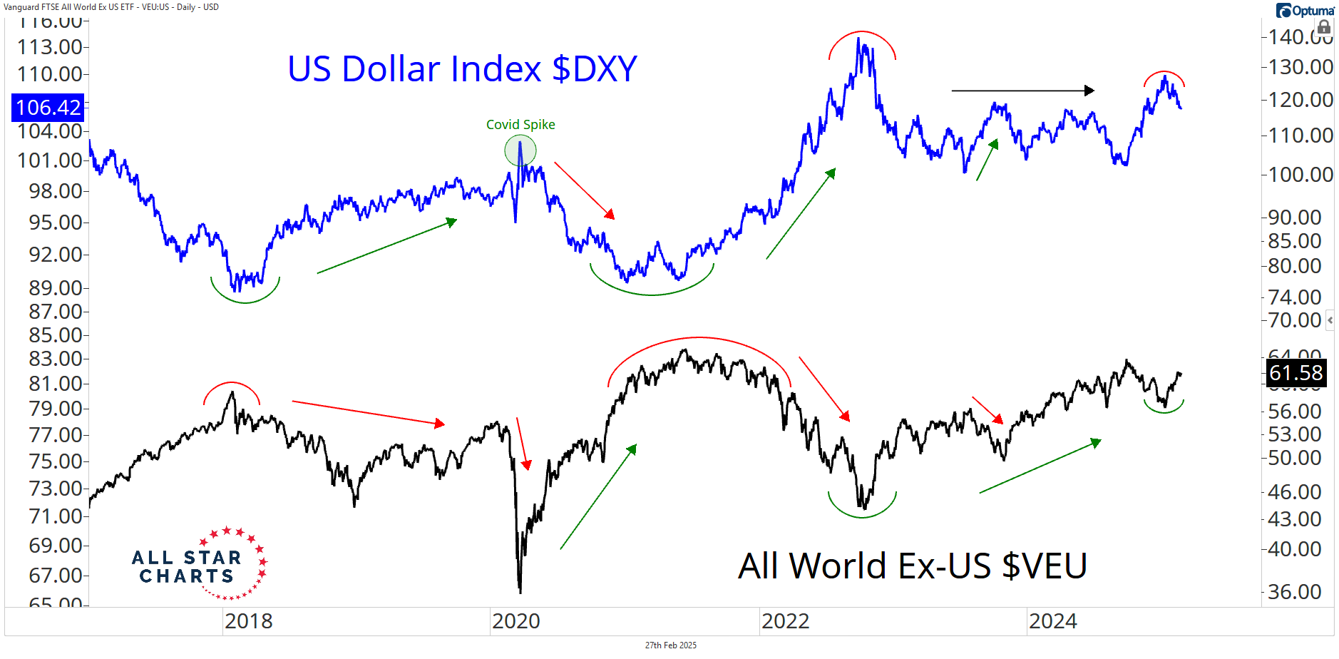 A clear way to visualize this is by comparing the All World Ex-US $VEU to the U.S. Dollar Index $DXY.