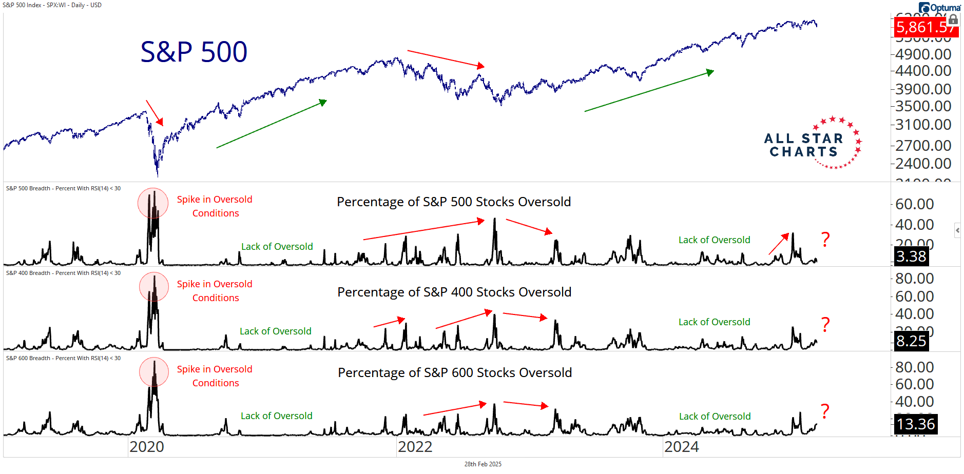 With that in mind, here’s a look at the percentage of stocks in the S&P 500, S&P 400, and S&P 600 that have reached oversold conditions compared to previous cycles.