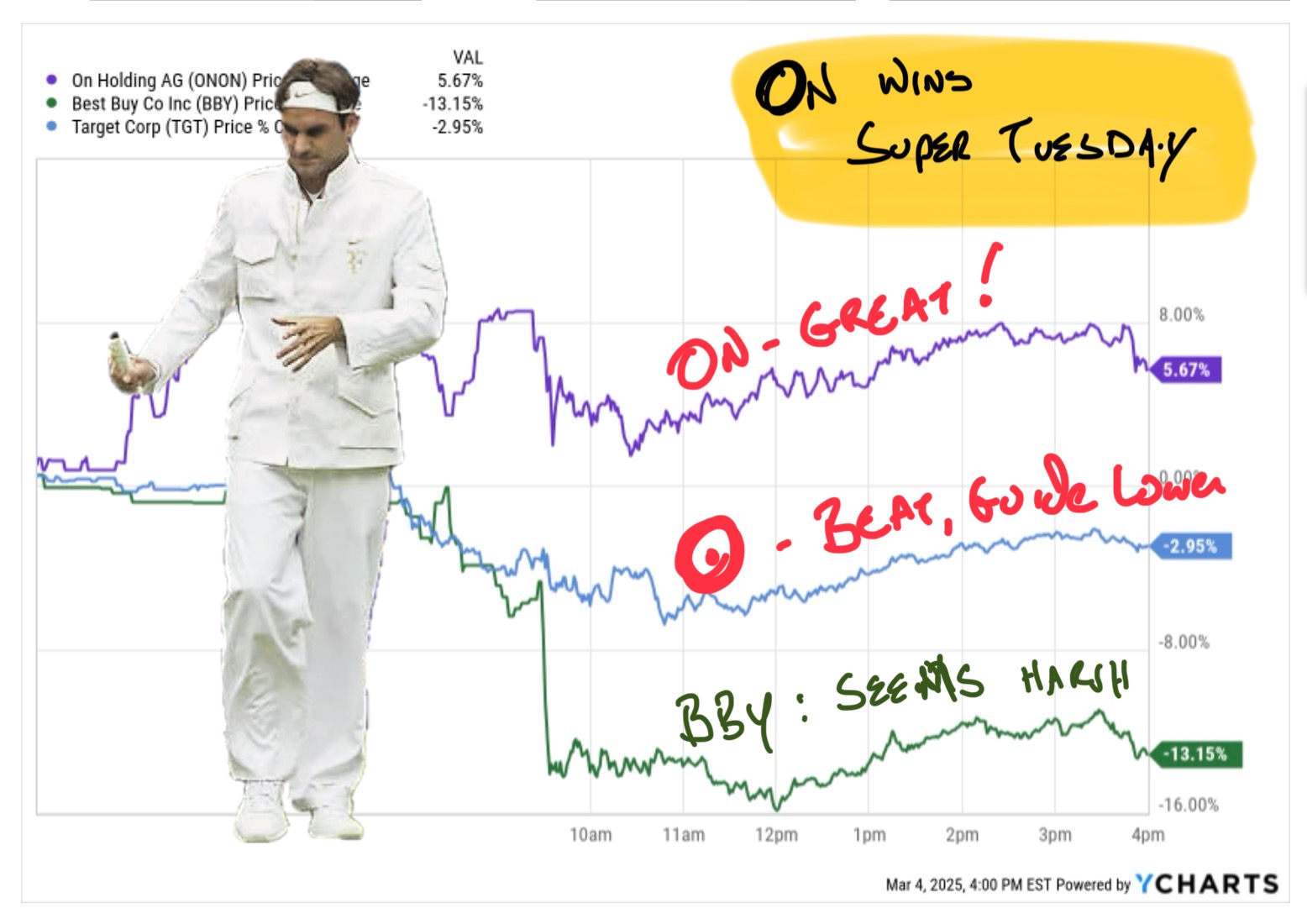 • The consumer is still stepping up for what they really want. ONON margins were over 60% (a record high) with huge growth. Look for that to be a bright light for FootLocker in the morning during what should be an otherwise dismal report.
