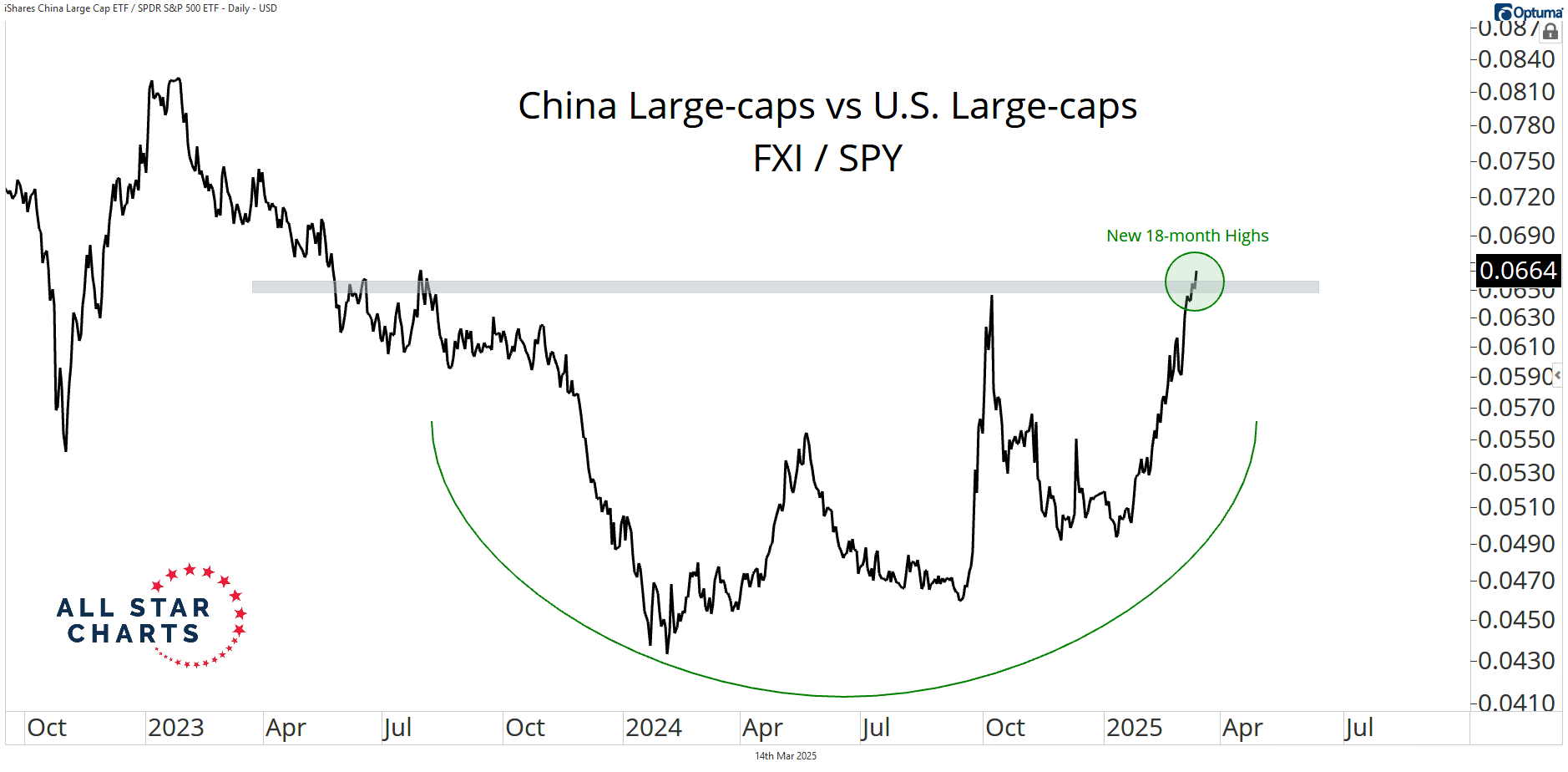 The Large-Cap China ETF $FXI just hit 18-month highs relative to the S&P 500 $SPY, signaling a potential shift in market leadership.
