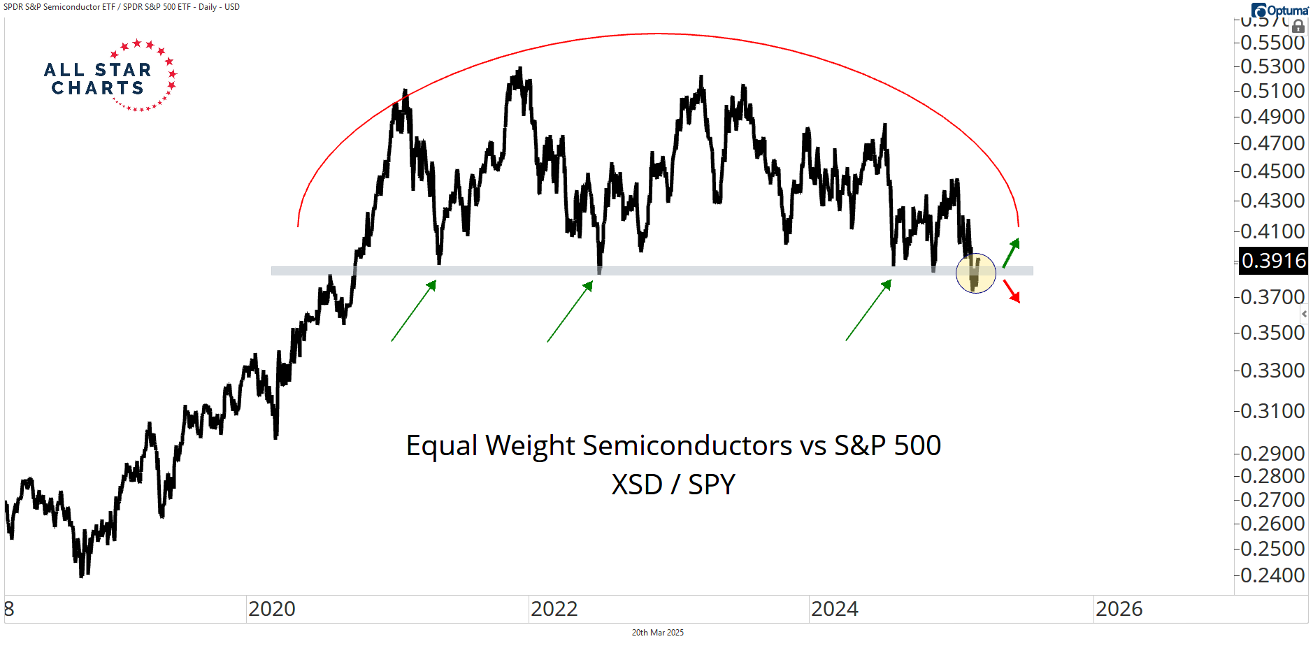 Alfonso's Daily Note Alfonso De Pablos highlights the day’s most important market-moving chart. Hanging by a Chip By Alfonso Depablos, CMT March 20, 2025 US equities are trying to prove themselves after several weeks of selling pressure. Buyers are stepping in and repairing some of the recent damage.When I think of the group of stocks that will determine whether the bulls regain control or not, I can’t help but think of semiconductors.They are quite literally the lifeblood of the world economy, carrying significant weight in major indexes across a variety of global markets.The Equal Weight Semiconductors ETF $XSD is a great way to get a true read on the group.When we look at it on a relative basis, it’s been carving out a massive top against the S&P 500. Right now, the ratio sits near its lower bounds—neither breaking down nor catching a bid higher. We’re just hanging in there.How this resolves will shape our positioning in the weeks ahead.A breakout higher would signal rotation back into U.S. equities and growth stocks, and is likely to happen alongside a broad market rally.But if this top completes, semis are likely to roll over on absolute terms as well. Under this scenario, stocks remain under pressure and we probably experience a steeper and longer correction than the one we’re looking at now.Alfonso More from Alfonso's Daily Note Alfonso Depablos, CMT The Return of the Trump Trade November 6, 2025 Alfonso Depablos, CMT Who’s Got It Right? November 5, 2025 Alfonso Depablos, CMT Weak Spots in a Bull Market November 4, 2025 See the Chart That MattersAlfonso’s Chart of the Day highlights the setups and inflection points shaping the next big market moves — before they hit the headlines. You must have JavaScript enabled to use this form. Email Address