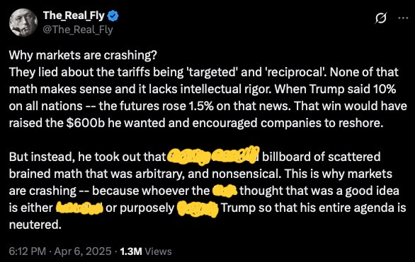 Every sell-off of significance happens because it's impossible to see a way out of it. What's different this time is it was triggered internally. America is seemingly declaring a trade war on the world. Maybe deals will get struck. Every day it continues the situation gets worse. More orders get delayed. More trust is lost with trading partners. The economic freeze happening right now, in real time, impacting the smallest businesses and most at risk workers, gerts deeper.