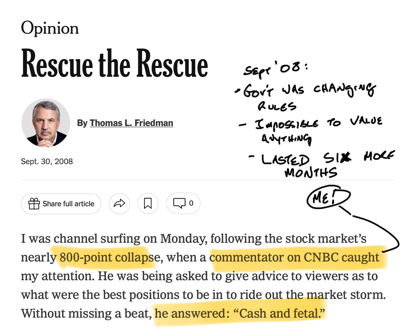 In 2008 I made the NY Times for mentioning my two favorite positions were "Cash and Fetal". That was after stocks had fallen 800pts (a lot at the time) the day prior. Lehman had collapsed. There were >5% rallies and crashes on alternating days. It was crazy times. It had to end someday.