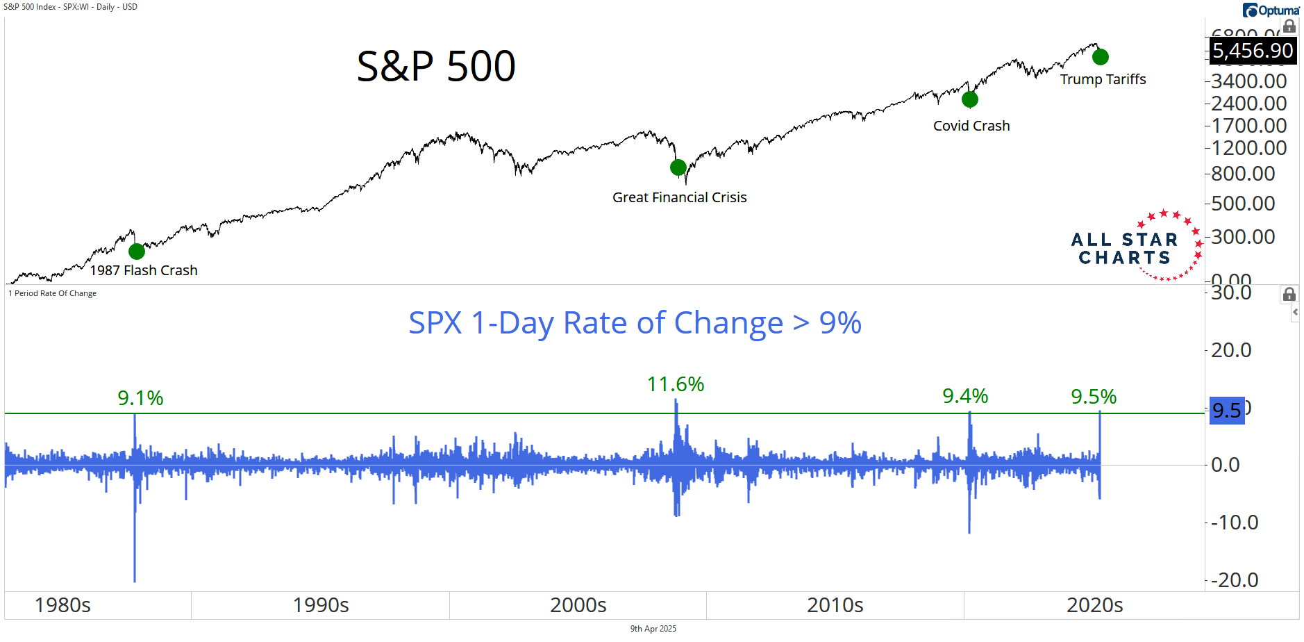Alfonso's Daily Note Alfonso De Pablos highlights the day’s most important market-moving chart. A Day for the History Books By Alfonso Depablos, CMT April 9, 2025 Sign up for my free note here.Today was one of the most epic sessions in the history of the stock market.Amid rumors around tariffs, the S&P 500 ripped higher, closing up 9.5% on the day.That makes it the third-largest one-day gain for the index going all the way back to 1950.Moves like this aren't just rare… they are historic.You can count on one hand how many times the S&P has rallied more than 9% in a single session in the last 75 years.The green dots in this chart show these historical rallies. Only during the depths of the Great Financial Crisis, have we seen stronger gains:October 13, 2008: +11.6%October 28, 2008: +10.8%Then we have to include:March 24, 2020 (Covid Crash): +9.4% March 13, 2020 (Covid Crash): +9.2%October 21, 1987 (Flash Crash): +9.1%These kinds of monster rallies tend to show up during bear markets — when volatility is elevated and emotions are running high.That context matters.A surge like today doesn’t mean we’re out of the woods. It means we’re in the thick of them.The volatility isn’t going anywhere.But this is a step in the right direction, and it marks serious progress for the bulls.Key levels were held, and now bullish signals are triggering, if only for a counter-trend rally. We’ll know more soon.Steve will be LIVE tomorrow at 9:45 a.m. ET to show you exactly what he's doing and how he's trading this bounce. Click here and don't miss it.Alfonso More from Alfonso's Daily Note Alfonso Depablos, CMT The Return of the Trump Trade November 6, 2025 Alfonso Depablos, CMT Who’s Got It Right? November 5, 2025 Alfonso Depablos, CMT Weak Spots in a Bull Market November 4, 2025 See the Chart That MattersAlfonso’s Chart of the Day highlights the setups and inflection points shaping the next big market moves — before they hit the headlines. You must have JavaScript enabled to use this form. Email Address
