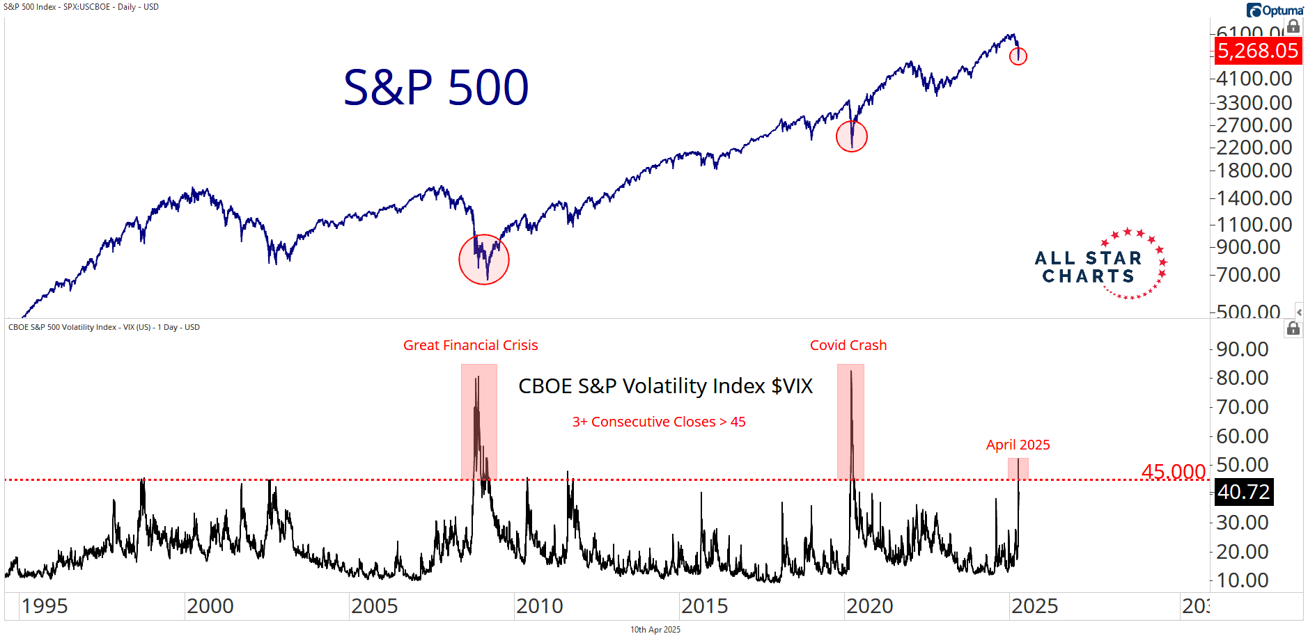 Alfonso's Daily Note Alfonso De Pablos highlights the day’s most important market-moving chart. High VIX, High Stakes By Alfonso Depablos, CMT April 10, 2025 Sign up for my free note here.The market’s a rollercoaster right now.Big moves. Wild swings. Sentiment flipping on a dime.Intraday ranges are wide, and positions can move fast.The CBOE Volatility Index $VIX just closed above 45 for three straight sessions this week.That’s only happened three times in the past 30 years: 🔻 2008 (Great Financial Crisis)🔻 2020 (Covid)🔻 2025 (Today)We’re in an extremely high-volatility environment.And with the VIX this elevated, here’s a rule of thumb:VIX ÷ 16 = the expected daily move in the S&P 500.So, with a ~40 VIX, expect at least a 2.5% per day—in either direction.This isn’t a time for complacency.It’s a time for discipline and adaptability.Stick to your process.Size accordingly.Alfonso More from Alfonso's Daily Note Alfonso Depablos, CMT The Return of the Trump Trade November 6, 2025 Alfonso Depablos, CMT Who’s Got It Right? November 5, 2025 Alfonso Depablos, CMT Weak Spots in a Bull Market November 4, 2025 See the Chart That MattersAlfonso’s Chart of the Day highlights the setups and inflection points shaping the next big market moves — before they hit the headlines. You must have JavaScript enabled to use this form. Email Address