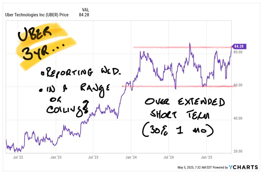 This week we hear from Uber on Wednesday (don't own it but would like to) and Peloton Thursday. Wildly different stories but part of the same theme. Specifically, neither is much impacted by anything less than a deep recession. Both are hard off recent lows. Uber has been running like a scalded chimp off the lows (up 30% in the last month) but has been chopping in a wide range for the last year. I'd love the chance to lock in on a pullback, ala Spotfiy.