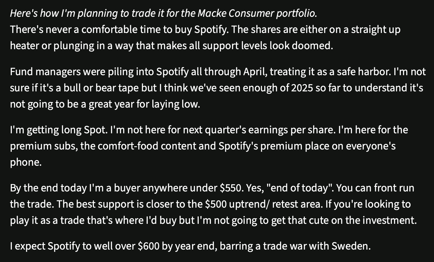 So last week when Starbucks was getting smacked to the mid-70s for doing things I want the company to do I was happy holding the shares (and explained the reasoning). That's why I didn't mind Amazon selling off on reporting pure excellence but with a "weak guide". Most importantly for our Spotify purposes, that's why I bought Spotify at $550 when shares were down 10% for missing numbers I didn't care about at all.