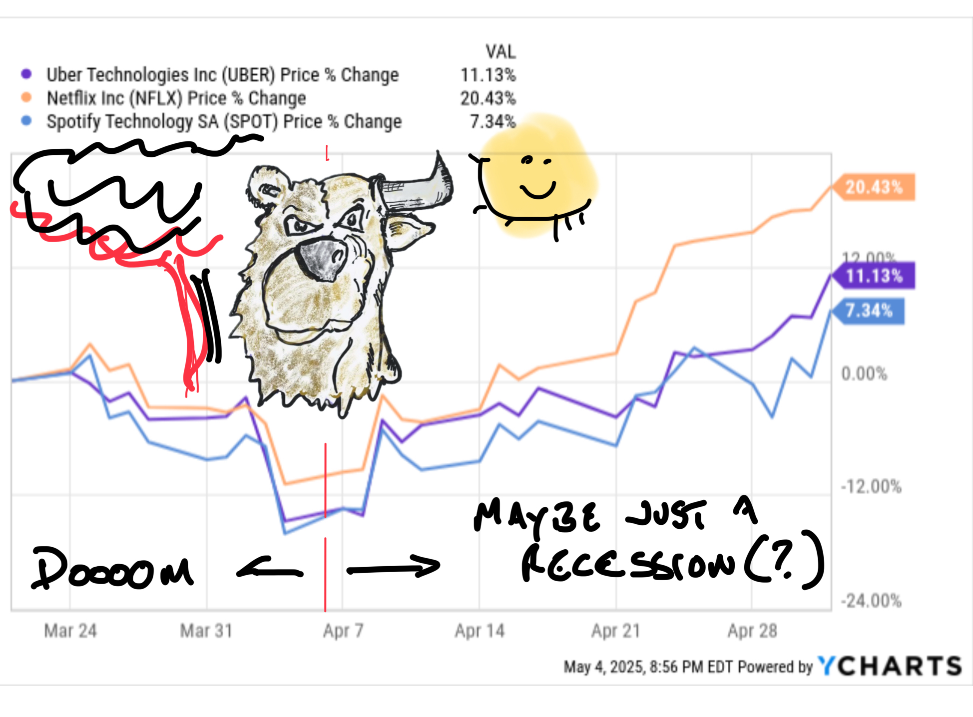 As discussed in the Spotify preview and earnings Report Card, I didn't care much about what Spotify reported for EPS or financial guidance. I cared about subscriber count. Specifically, premium subscribers. I don't know anything more than anyone else about how these Interesting Times work out in terms of the economy over the next 6 months but I know a certain level of Chaos as been created. Whatever happens from here, everything since April 2nd has worked to the relative benefit of the most powerful, liquid, flexible consumer names.