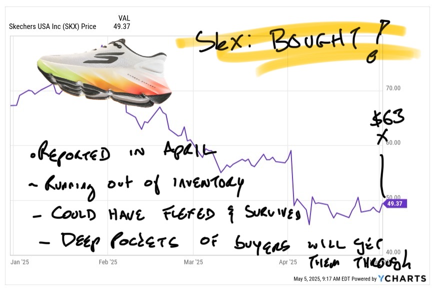 The stock held, which was bullish but it would seem Skechers thought the certainty of cash in hand from 3G was better than rolling the dice of adjusting the supply chain on the fly. Today Skechers announced an agreement to be bought for $63/ share. A 30% premium over the price on Friday but below where SKX was trading in February.