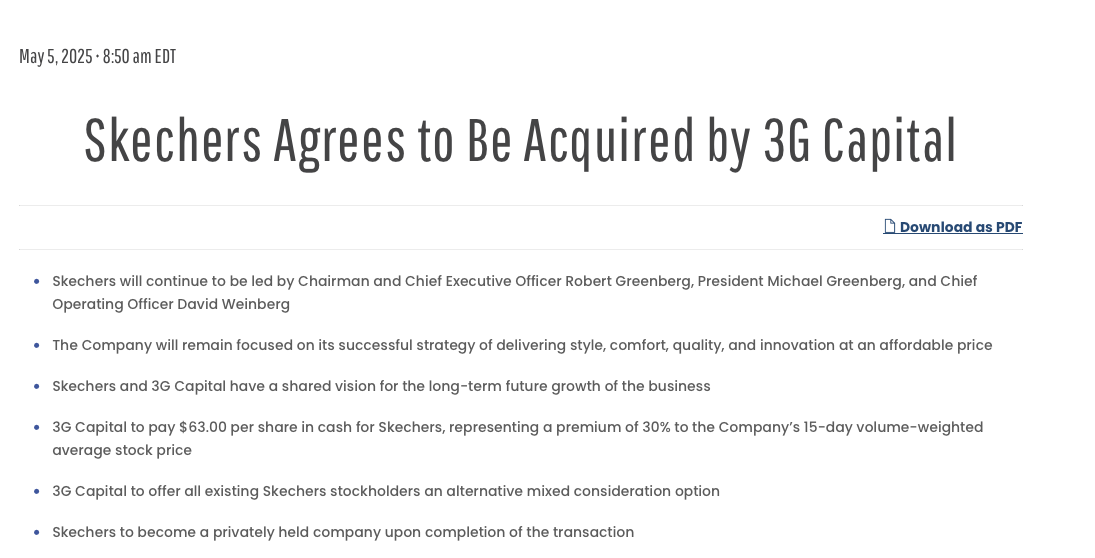 It's important that A) Skechers was worried enough to take the cash and B) Private Equity was there to offer a bid. Skechers was looking at reporting for the next 9 months having no idea what the numbers would be. After a quarter century of printing solid returns for shareholders the certainty of an offer beat the chaos of the moment.