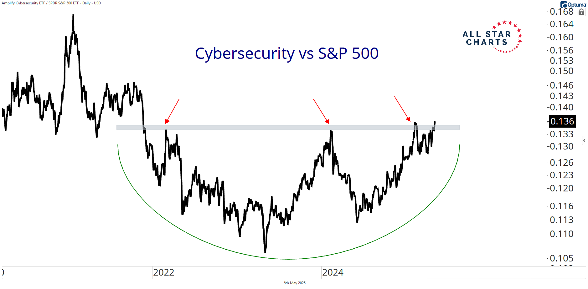 Alfonso's Daily Note Alfonso De Pablos highlights the day’s most important market-moving chart. The Next Big Tech Leader? By Alfonso Depablos, CMT May 6, 2025 Sign up for my free note here.With the market back above key levels, we're seeing early signs of rotation, particularly into tech. Among the tech subsectors, cybersecurity is emerging as a standout, showing strong potential to lead the next phase of growth.This group has been carving out a massive bottoming formation relative to the S&P 500 for over two years. We've seen multiple failed attempts at the top of the range — but now we're back at those former highs, and this thing looks ready to go.This is what a bearish-to-bullish reversal looks like.If this base completes and this breakout holds, then it will mark the start of a new cycle of outperformance — and I plan to be right there with it.Alfonso More from Alfonso's Daily Note Alfonso Depablos, CMT The Return of the Trump Trade November 6, 2025 Alfonso Depablos, CMT Who’s Got It Right? November 5, 2025 Alfonso Depablos, CMT Weak Spots in a Bull Market November 4, 2025 See the Chart That MattersAlfonso’s Chart of the Day highlights the setups and inflection points shaping the next big market moves — before they hit the headlines. You must have JavaScript enabled to use this form. Email Address