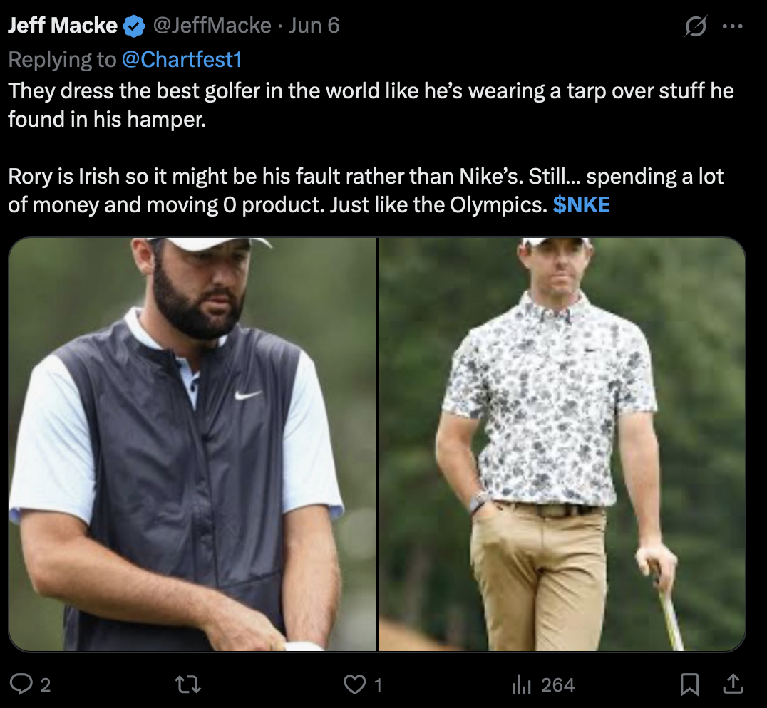 Brooks is beating the crap out of Justin but moving almost zero product for Nike, which pays Brooks millions to look annoyed and hit absolute BOMBS in Majors. Nike proudly, famously spends millions sponsoring athletes which it then dresses horribly. The former home of Tiger Woods, Nike now dresses world #1 Scottie Scheffler like he found something in the hamper.