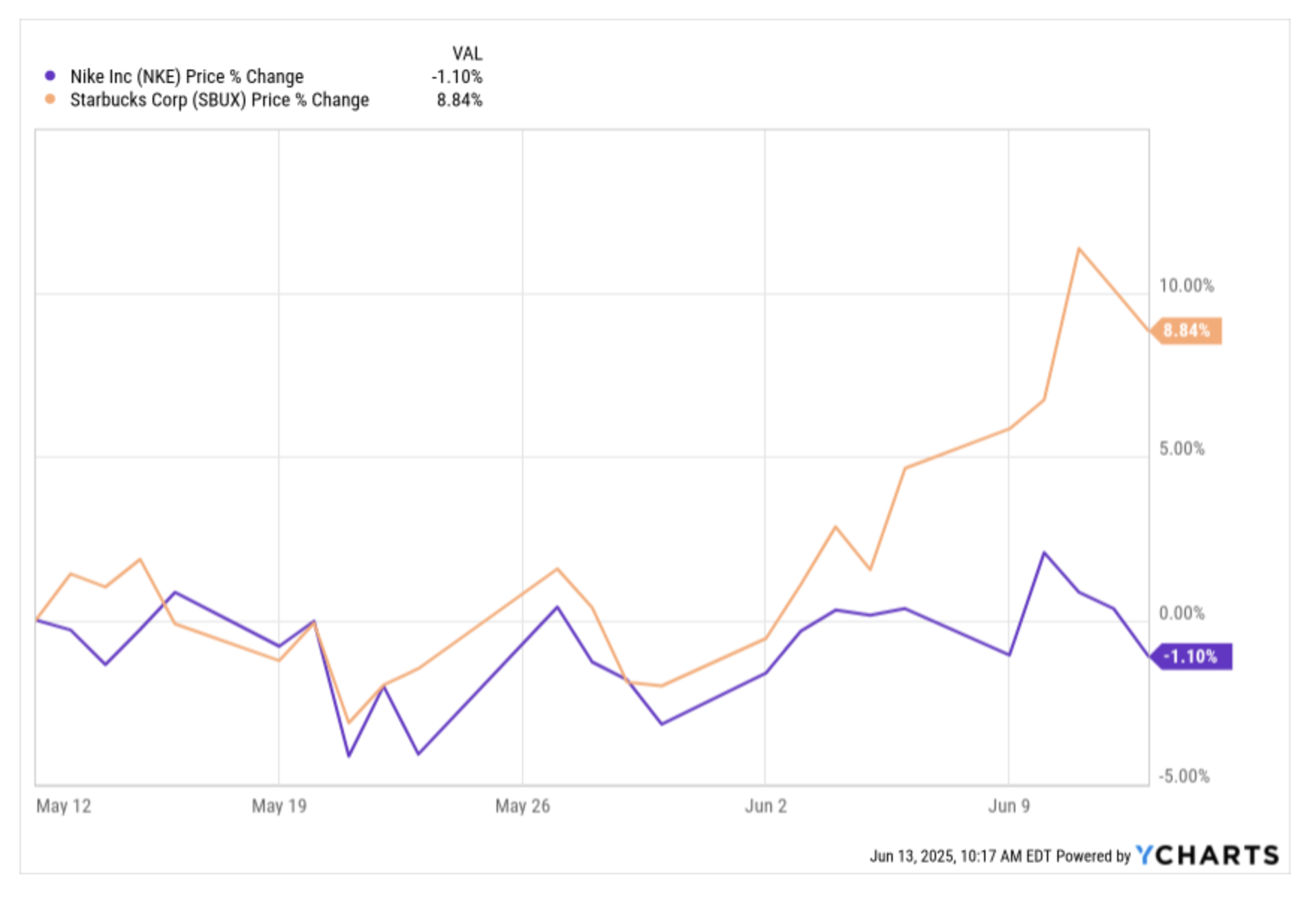 Nike is bouncing on the tariff delay but can they really be so consistently uninspired in apparel, footwear AND the website and make a consistent combeback? Because they still seem pretty lost and lack the action of say, Starbucks (another consumer brand with a similar list of problems as Nike.) I think it matters that my Starbucks experience is improved but Nike is still working on long-promised innovation.