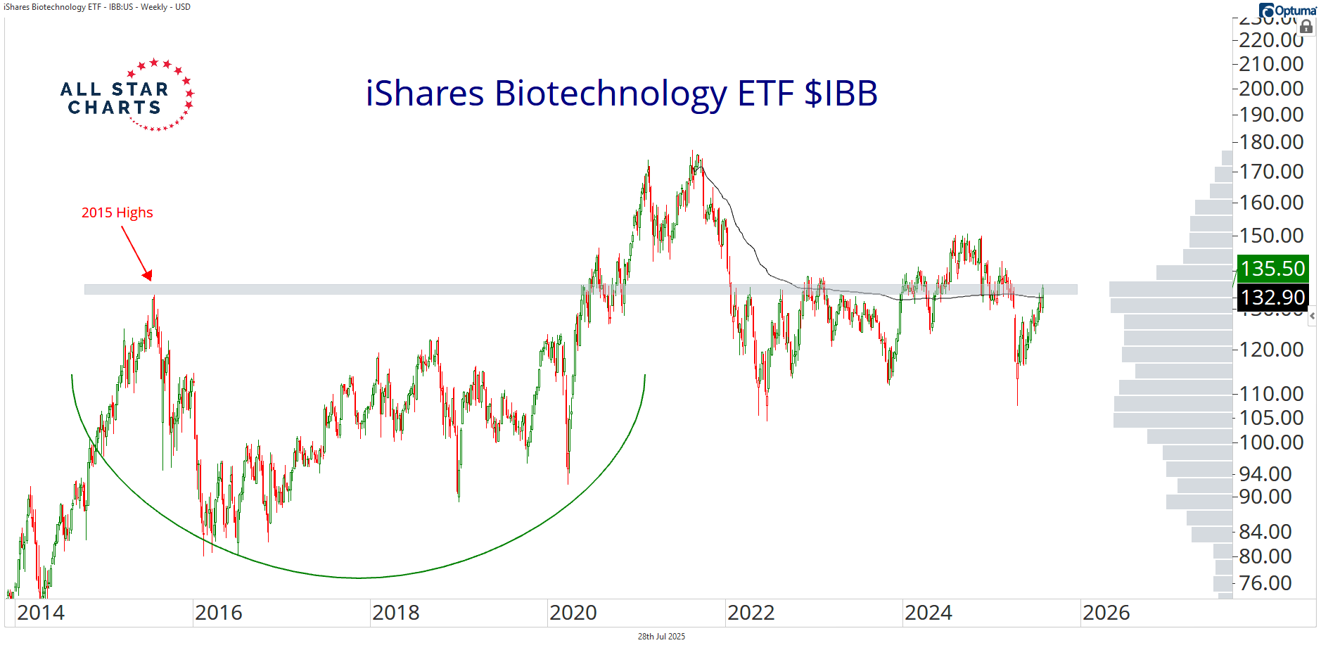 Alfonso's Daily Note Alfonso De Pablos highlights the day’s most important market-moving chart. Don’t Sleep on Biotechs By Alfonso Depablos, CMT July 28, 2025 Sign up for my free note here.Health Care has become the forgotten sector.It’s been the worst performer year-to-date — totally left behind while everything else trends higher.Nobody wants to touch it as the risks have been well advertised. And it shows. The sector just wrapped up one of the worst streaks of underperformance in its history.But here’s the thing about market extremes like this. When everyone’s piled onto one side of the trade… there’s no one left to drive it any further.That’s precisely when the tide turns.So what if Health Care starts catching a bid?What if it plays a little catch-up here?Strazza’s been pounding the table about this strategy lately.And to me, Health Care fits the bill perfectly for the next rotation.Now, if we’re going to talk about Health Care, we have to talk about Biotech.It’s the most aggressive corner of the space — high beta, ultra-sensitive to interest rates, and pure risk-on.And right now, it’s knocking on the door of a huge breakout.Just pull up the chart of the cap-weighted Biotech ETF $IBB. It’s pressing right up against 135 — and that level matters.It marks the prior cycle highs from 2015.It’s also where the anchored VWAP from the all-time highs lands.And if you throw on a volume-at-price indicator, you’ll see a massive buildup of price memory right around that area.This major polarity zone has acted like a magnet for nearly a decade.Any decisive move above 135 could light the fuse and mark the beginning of a new leg higher.Don't sleep on biotechs.We’re not.In fact, a couple weeks ago we did a full deep dive — highlighting the best biotech setups for ASC Premium members.If you want access to these trades, click here.Stay sharp,Alfonso More from Alfonso's Daily Note Alfonso Depablos, CMT The Return of the Trump Trade November 6, 2025 Alfonso Depablos, CMT Who’s Got It Right? November 5, 2025 Alfonso Depablos, CMT Weak Spots in a Bull Market November 4, 2025 See the Chart That MattersAlfonso’s Chart of the Day highlights the setups and inflection points shaping the next big market moves — before they hit the headlines. You must have JavaScript enabled to use this form. Email Address