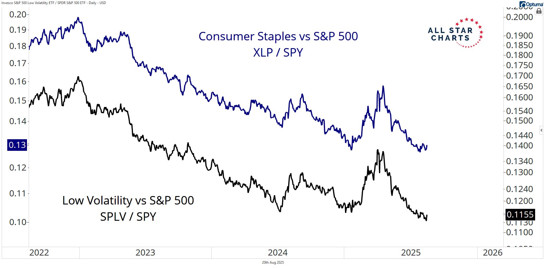 We like to track this by looking at Consumer Staples and Low Volatility stocks relative to the broader market.