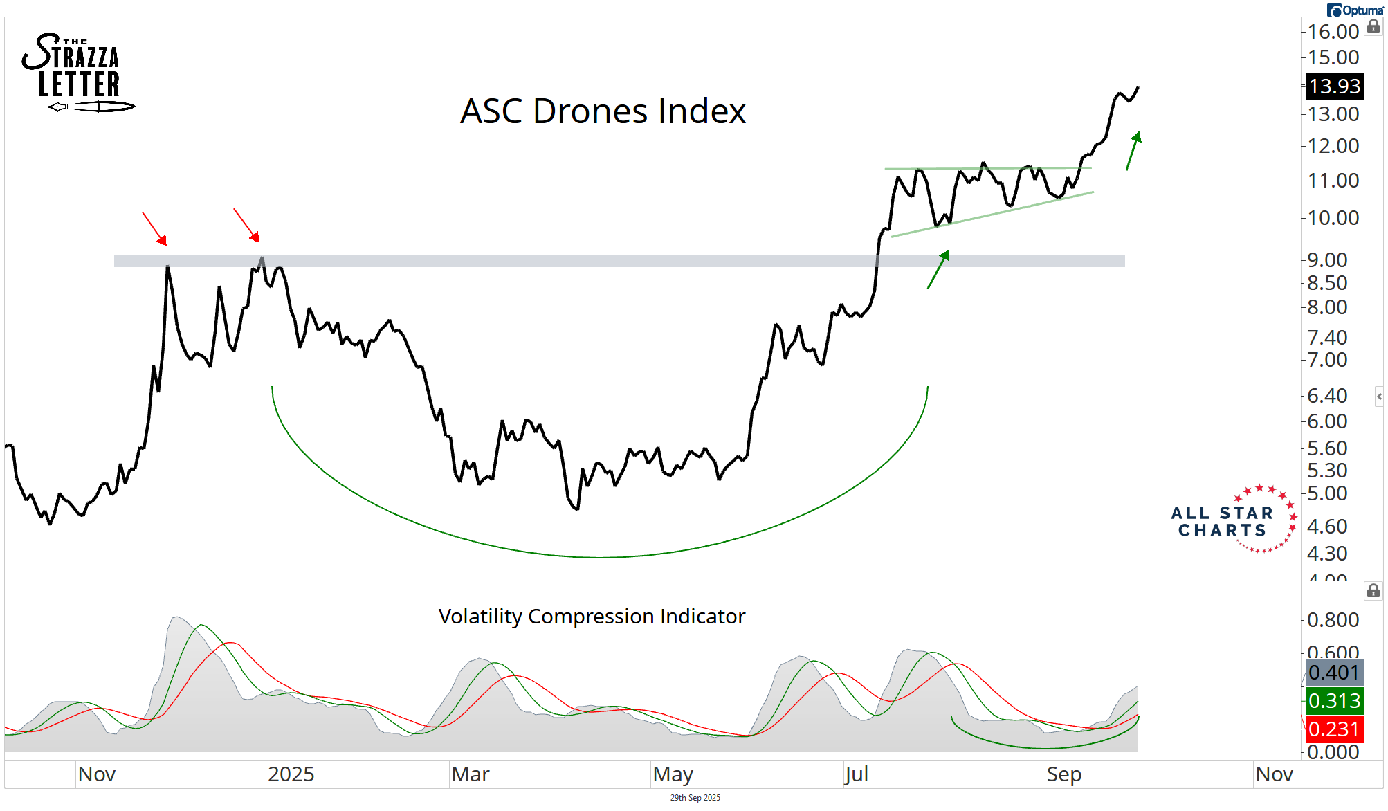 That was a false start, but after coiling up for a few more months, this group is taking off now. Here’s our Custom Drone Index breaking out of a textbook continuation pattern.