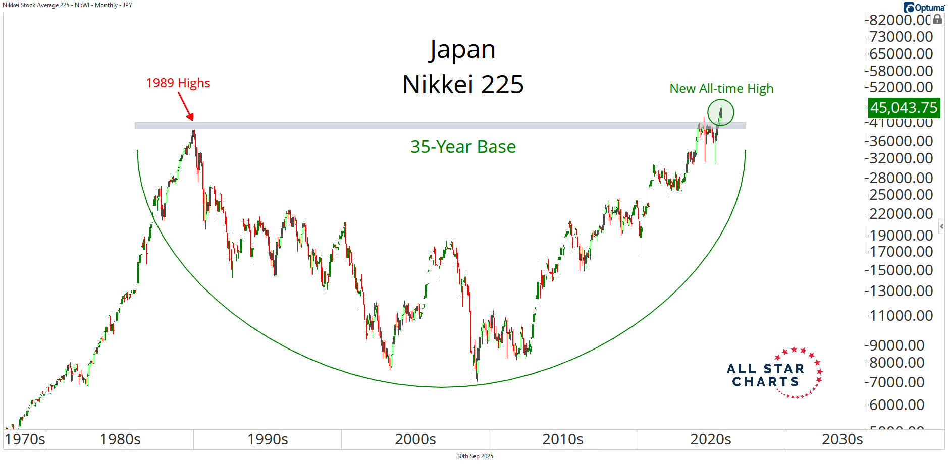 Fast forward to 2025, and the Nikkei is breaking out of a massive base.