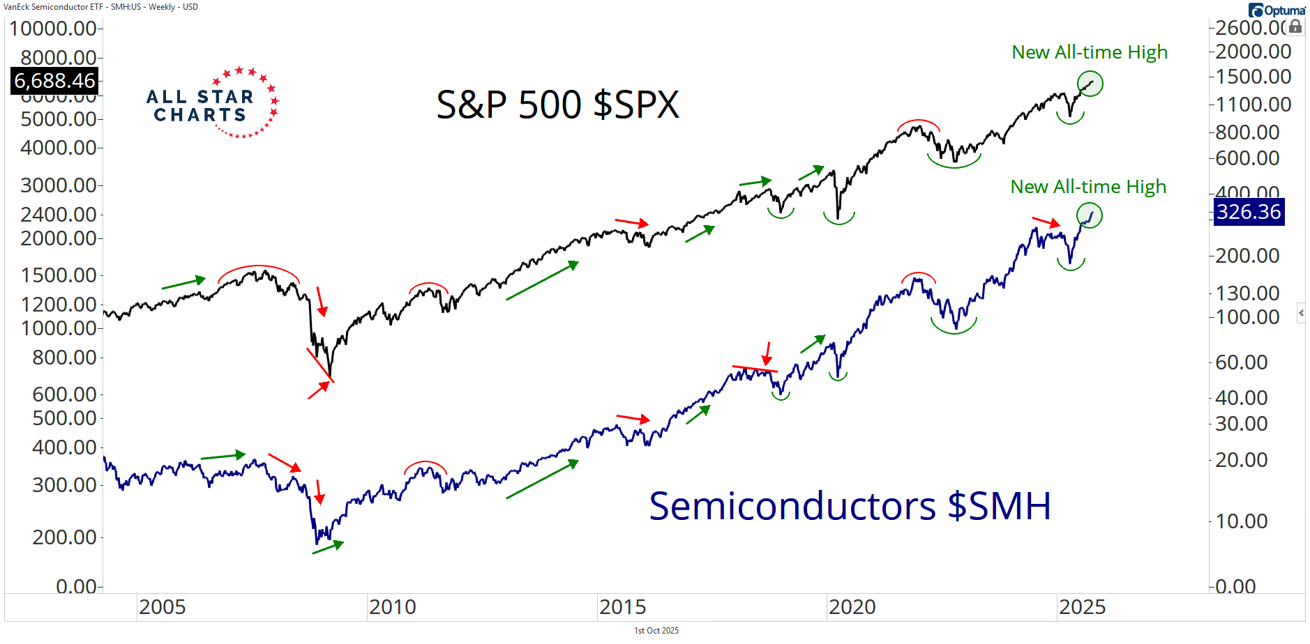 Alfonso Depablos, CMT From Rails to Chips October 1, 2025 Dow Theory has always been one of my favorite topics.It’s wild how principles from over 100 years ago still apply today.Back then, Charles Dow split the market into two groups: the companies that made the goods (Industrials) and the ones that delivered them (Railroads).But in today’s world, goods and services are powered and delivered in a huge way by Technology — and at the center of it all are Semiconductors.We've added Semiconductors to our analysis as we view these companies as modern transportation stocks.They are the ultimate risk-on barometer. As they go, the market goes. History has shown time and again just how critical this group is.And here they are, making new all-time highs alongside the S&P.For me, it’s really hard to fight the tape, especially at the index level when these stocks are doing well.So I’m sticking with the trend, following the evidence, and letting the market prove me wrong if conditions change.Stay sharp,Alfonso De PablosDirector of Research, All Star Charts Filed Under: Alfonso, ASC Share Article