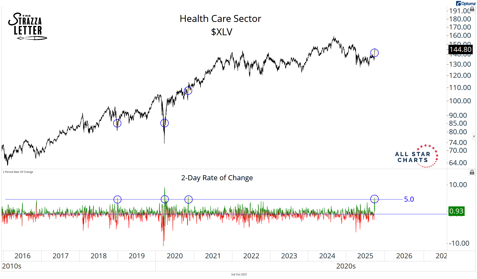 Here’s SPDR Health Care $XLV zoomed out about 10 years with the 2-day rate of change in the lower pane: