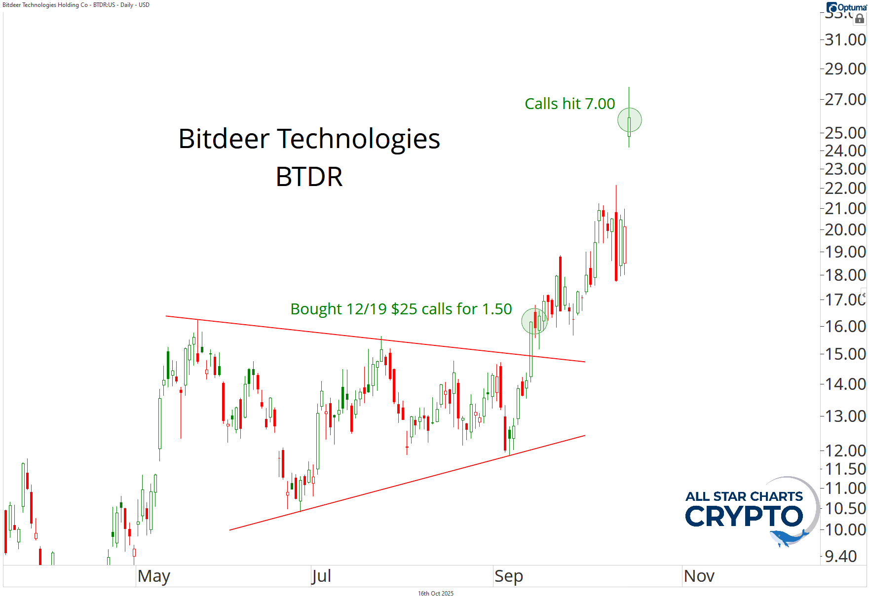 On September 15, we grabbed the $BTDR 12/19 $25 calls for $1.50. The mining space was firing on all cylinders, and the stock was breaking out — a perfect setup.