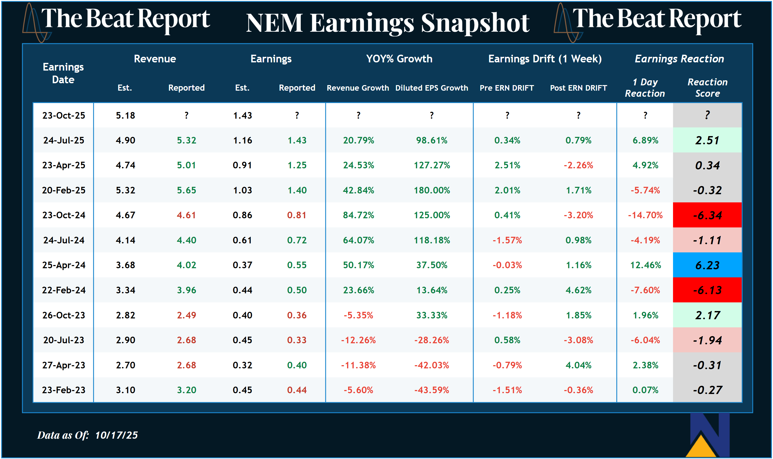 Here are the past 3 years of earnings results & reactions for NEM πŸ‘‡