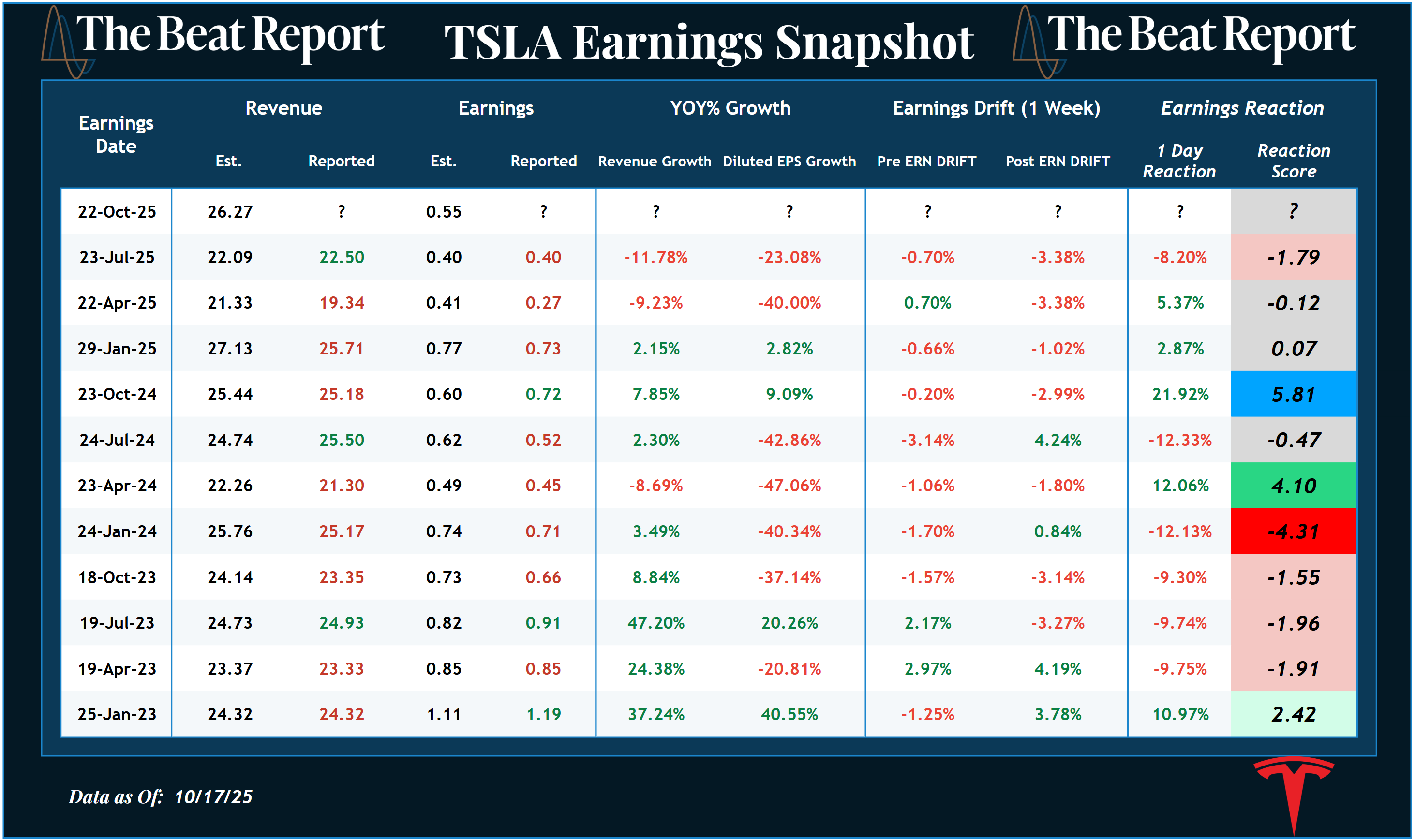 Here are the past 3 years of earnings results & reactions for TSLA πŸ‘‡