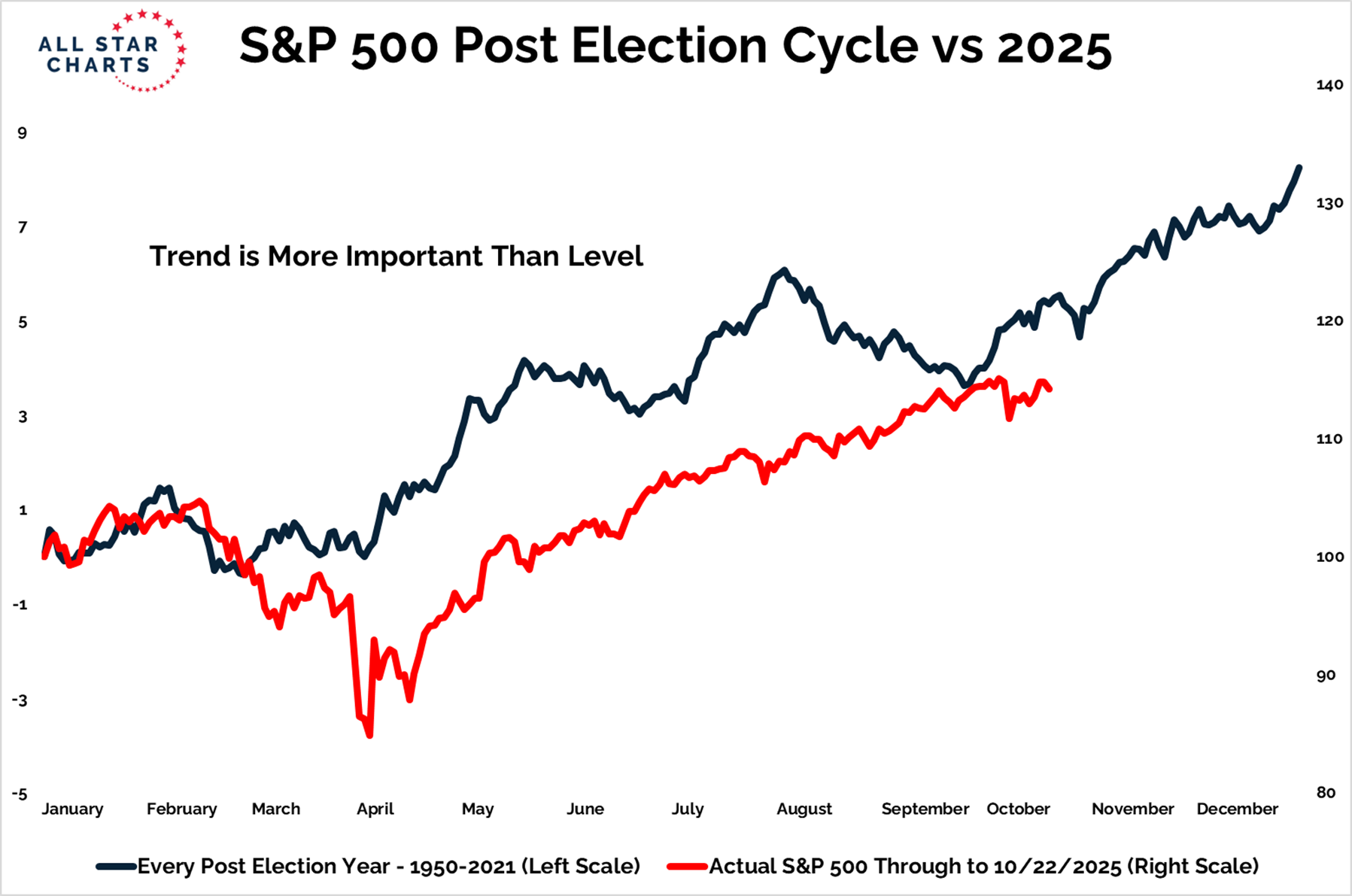 The chart below illustrates this, tracking the S&P 500’s post-election year performance from 1950 to 2021 (in blue), compared to 2025 so far (in red).