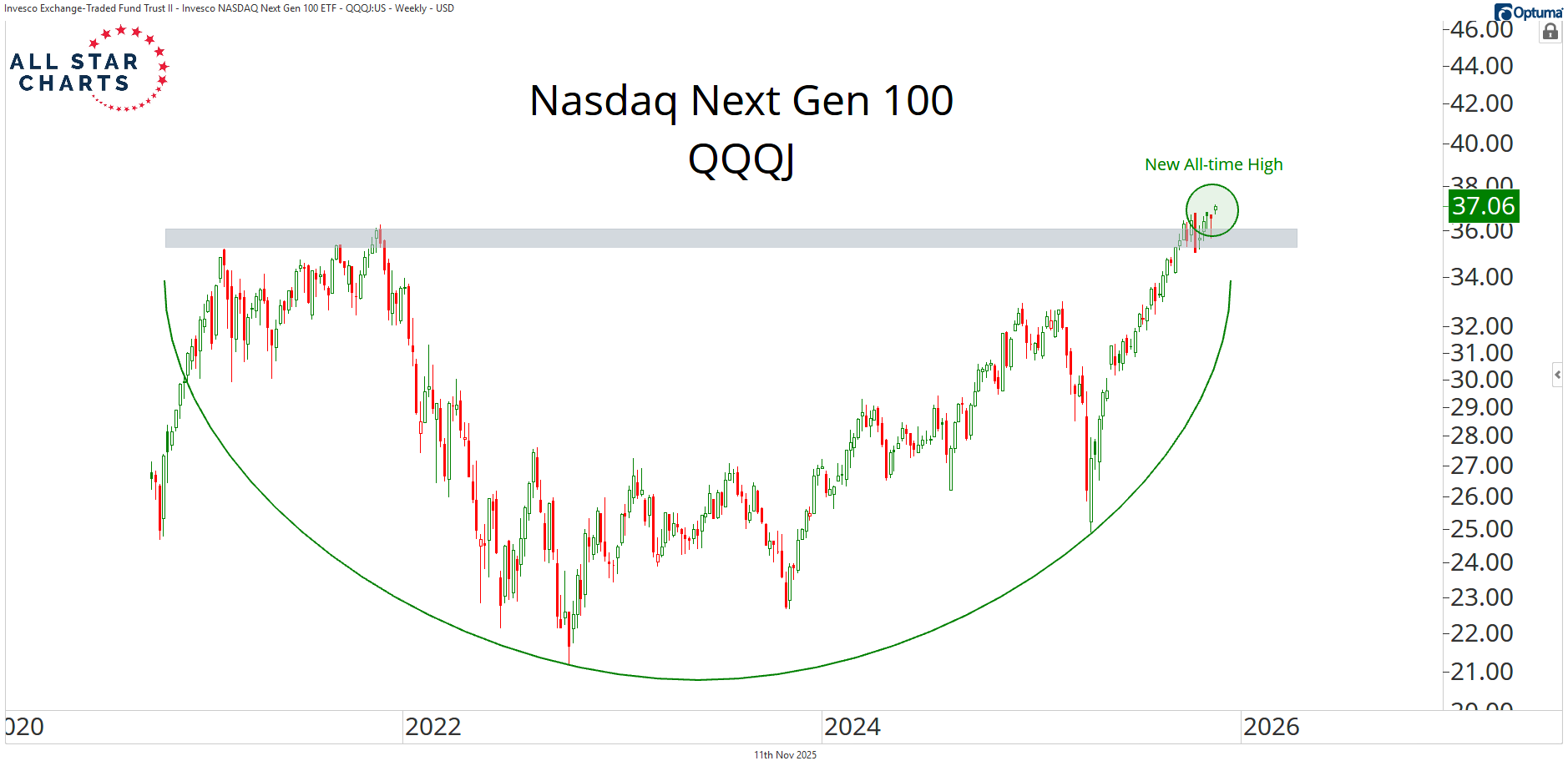 That’s what the Nasdaq Next Gen 100 $QQQJ tracks — the 101st to 200th largest companies.