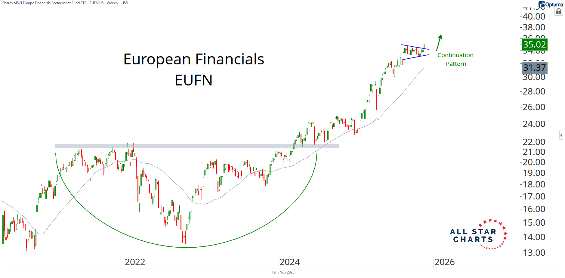 In fact, the European Financials ETF $EUFN is resolving higher from a tight continuation pattern to new all-time highs.