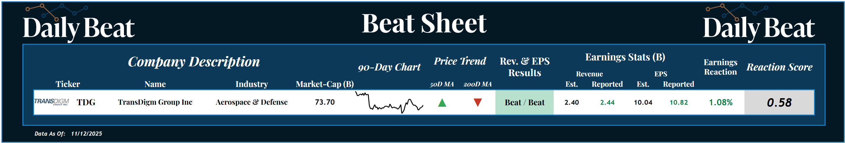Wednesday's only beat came from TransDigm $TDG, the $74B producer of aircraft parts and systems used in commercial and military planes. The company beat expectations across the board and had a +0.58 reaction score.