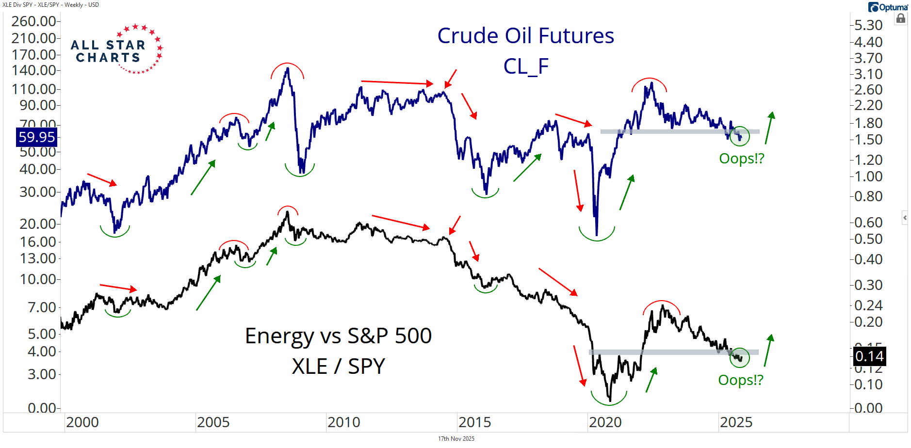 Alfonso's Daily Note Alfonso De Pablos highlights the day’s most important market-moving chart. What If These Aren’t Tops? By Alfonso De Pablos, CMT November 17, 2025 Sometimes the biggest moves come from patterns that don’t behave the way everyone expects.They trap the majority, shake people out, and then make the real move when no one’s positioned for it.And I’ve gotta say… Energy is starting to look like one of those situations.This chart below represents Energy stocks relative to the S&P 500, overlaid with Crude Oil futures. They look almost identical — and for the past couple of years, both have been carving what many would call “major tops.”But here’s the twist…What if those tops aren’t tops at all?If these end up being failed breakdowns, then look out for a ripper.One of the first things I learned is that failed moves tend to lead to fast moves in the opposite direction.That hasn’t happened yet — but if it does, the setup for a serious squeeze higher is very real.In that scenario, Energy $XLE finally breaking above its 2008 highs isn’t some fantasy — it’s the natural next step.Let me know what you think! I would love to hear from you!Alfonso De Pablos, CMTDirector of Research, All Star Charts More from Alfonso's Daily Note Alfonso De Pablos, CMT Offense vs Defense November 14, 2025 Alfonso De Pablos, CMT How Bearish is BTC? November 13, 2025 Alfonso De Pablos, CMT European Financials Don’t Lie November 12, 2025 See the Chart That MattersAlfonso’s Chart of the Day highlights the setups and inflection points shaping the next big market moves — before they hit the headlines. You must have JavaScript enabled to use this form. Email Address