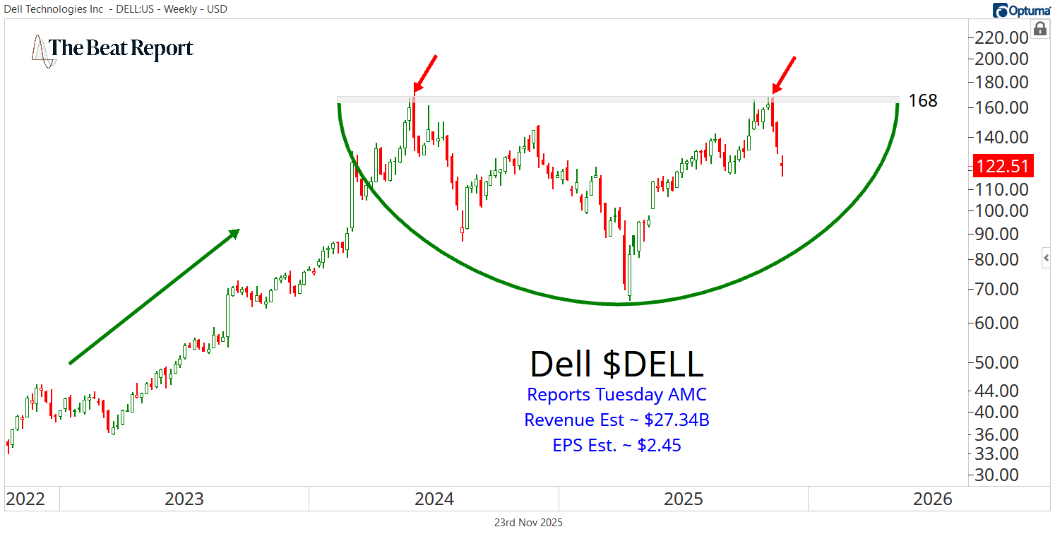 If DELL can hold above the September low, we expect a bounce back toward 168. If that level fails to hold, a retest of 100 is likely not far away.