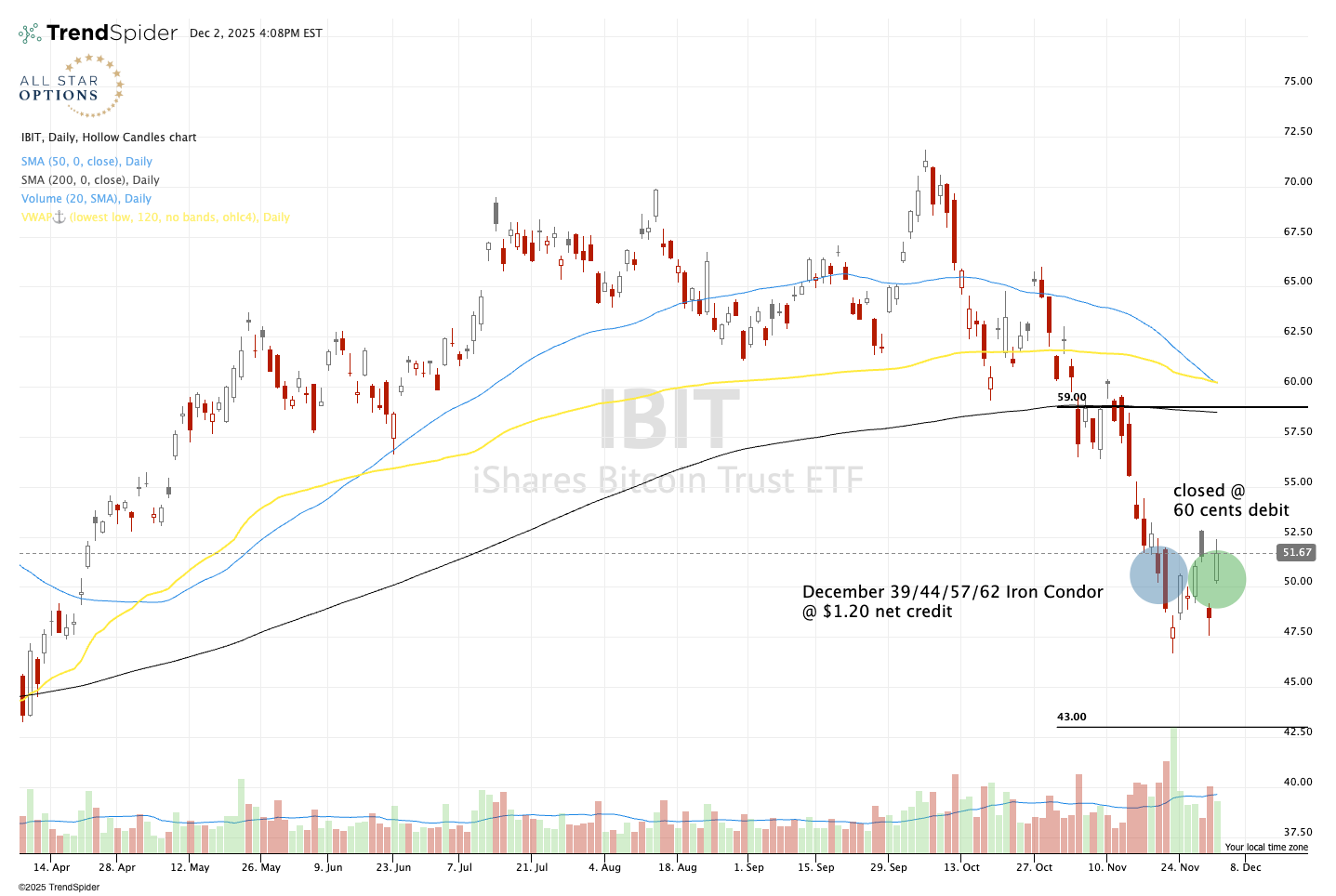 The bet I made was that IBIT would stay stuck in a range above 43 and below 59 for at least a few weeks, and that implied volatility would decrease from elevated levels, bringing options premiums down with it.