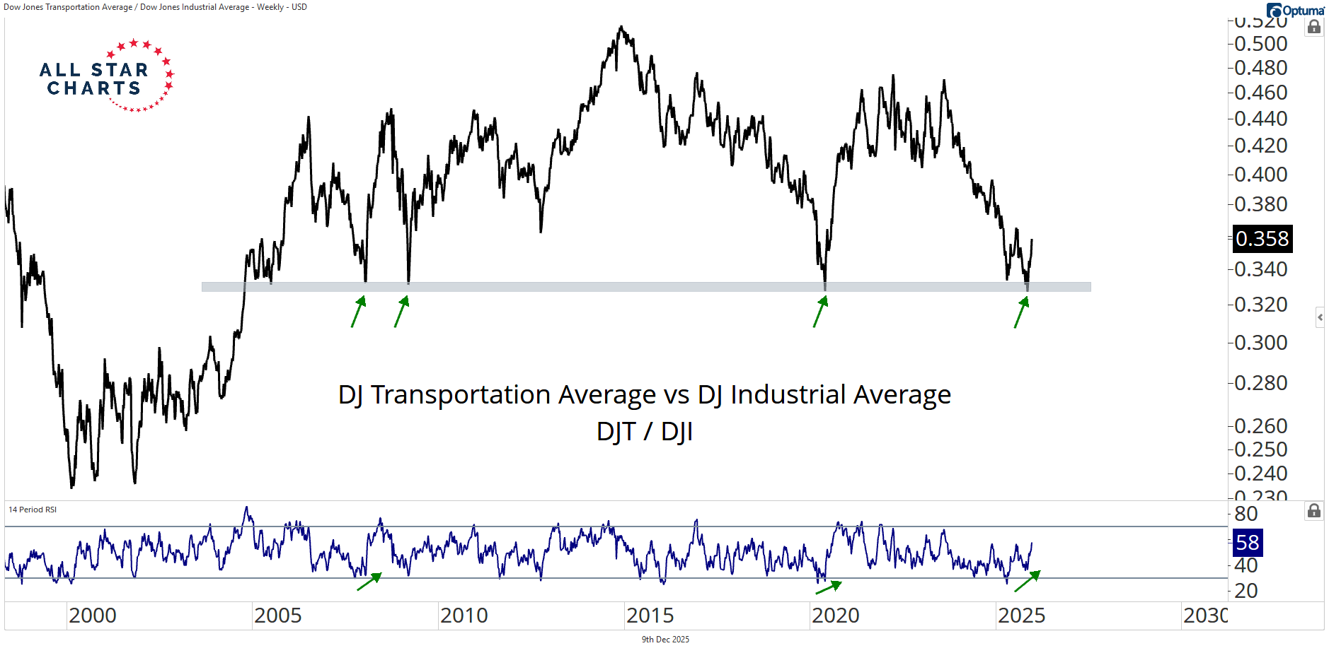 This ratio is finding support at a historic level — the same zone that marked major secular turning points during both the GFC and the COVID crash.