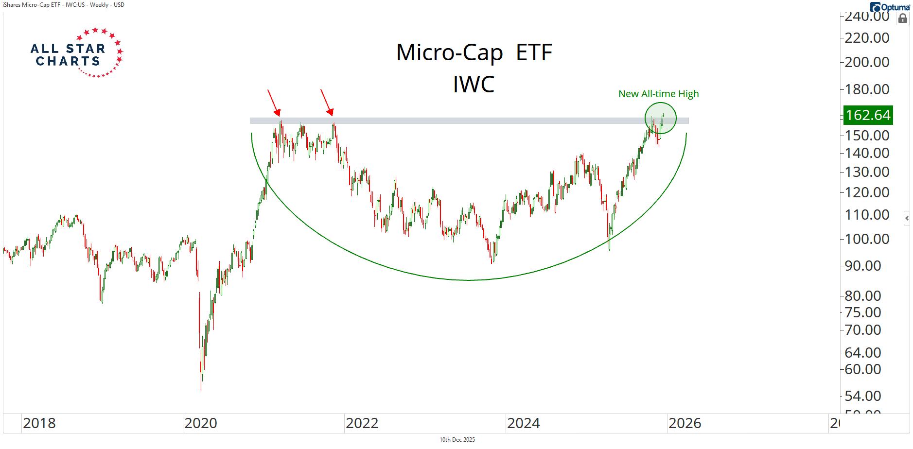 Alfonso's Daily Note Alfonso De Pablos highlights the day’s most important market-moving chart. Little Giants By Alfonso De Pablos, CMT December 10, 2025 Sing up for my free daily note here.As we head into year-end, I think it’s worth looking beneath the surface to see where real risk appetite is showing up.And right now, it’s flashing in a place most people never bother to look: micro-caps.These stocks have been ignored for years, lagging behind the broader market, but now they’re starting to participate.Take a look at the iShares Micro-Cap ETF $IWC pressing up against fresh all-time highs. These are the smallest publicly traded companies in America — the riskiest names in the entire market.So when they start breaking out, it’s not noise. It’s a message.If this move sticks, it’s exactly the kind of behavior you only see when investors are willing to embrace risk.That’s not bearish — that’s classic bull-market character.It also speaks to something even more important: broadening participation.The tiniest stocks in the market are stepping up and joining the trend — exactly what healthy markets tend to do.Let me know what you think — I’d love to hear your feedback!Alfonso De Pablos, CMTDirector of Research, All Star Charts More from Alfonso's Daily Note Alfonso De Pablos, CMT Are You Buying the Trannies? December 9, 2025 Alfonso De Pablos, CMT Energy Set to Lead the Next Rotation December 4, 2025 Alfonso De Pablos, CMT Primary Uptrends Stay Intact December 3, 2025 See the Chart That MattersAlfonso’s Chart of the Day highlights the setups and inflection points shaping the next big market moves — before they hit the headlines. You must have JavaScript enabled to use this form. Email Address