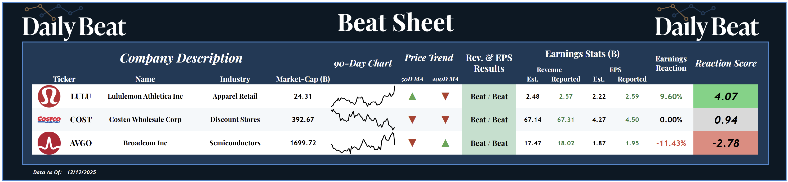 At the top of Friday's Beat Sheet was the $24B apparel retailer, Lululemon $LULU. Following a double beat, shareholders were rewarded with a +4.07 reaction score.
