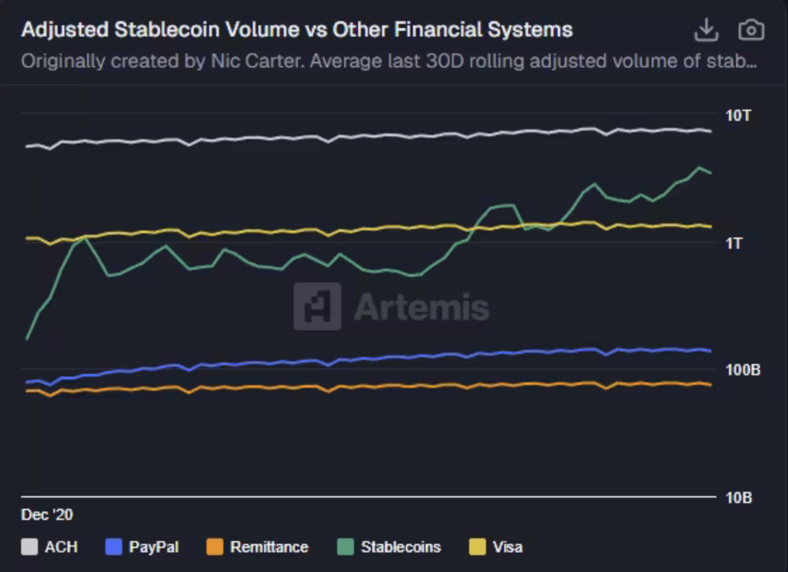 Heading into 2026, stablecoins are projected to process more volume than ACH.