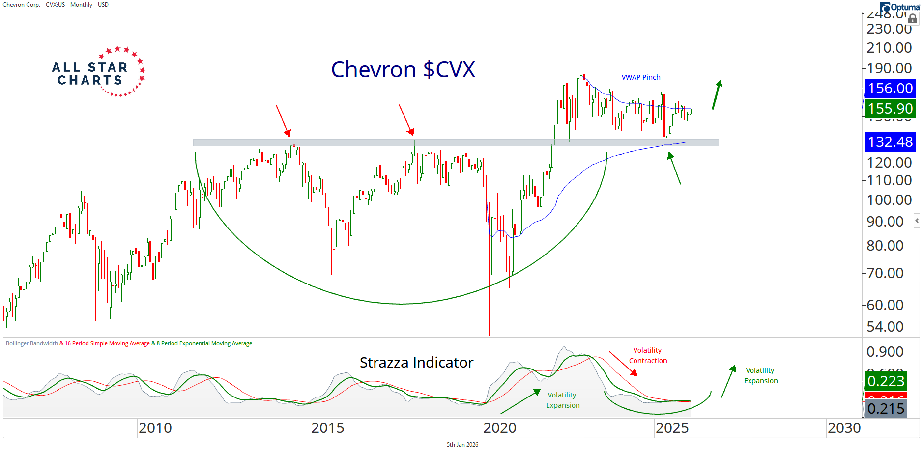 Chevron $CVX tells a similar story, but in a different way. It’s trapped in a massive multi-year coil, pinned by converging VWAPs.